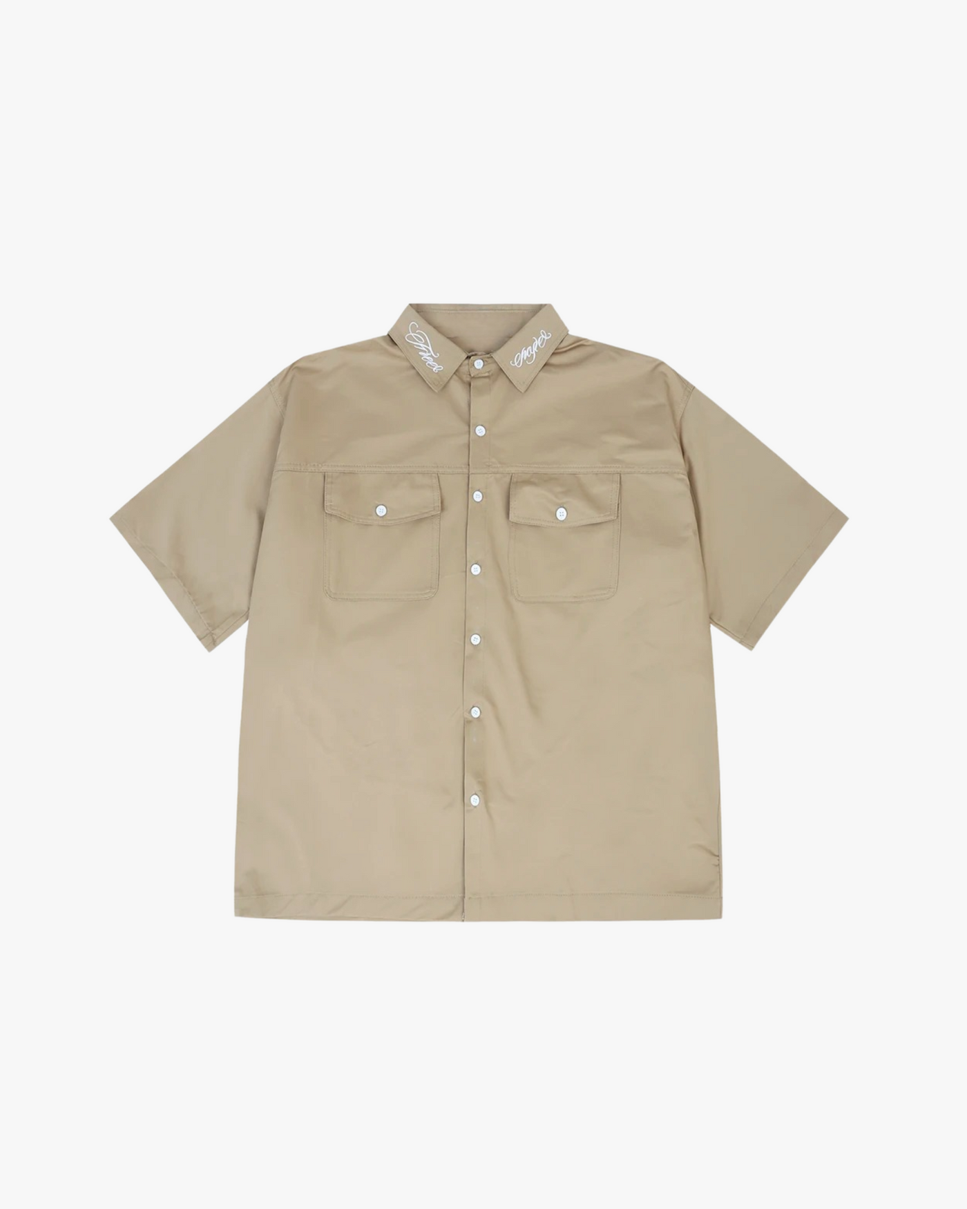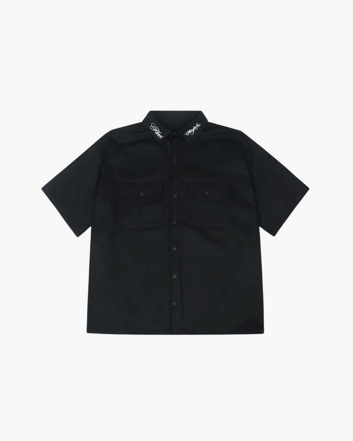 This solid-color casual shirt is designed for those who want to stand out with style. Crafted from lightweight and durable fabric, it features a classic collar detailed with embroidered lettering for a refined streetwear touch. Another embroidered graphic decorates the back, adding unique personality to the piece. Two chest pockets enhance both style and functionality, making it a perfect choice for layering or wearing on its own.