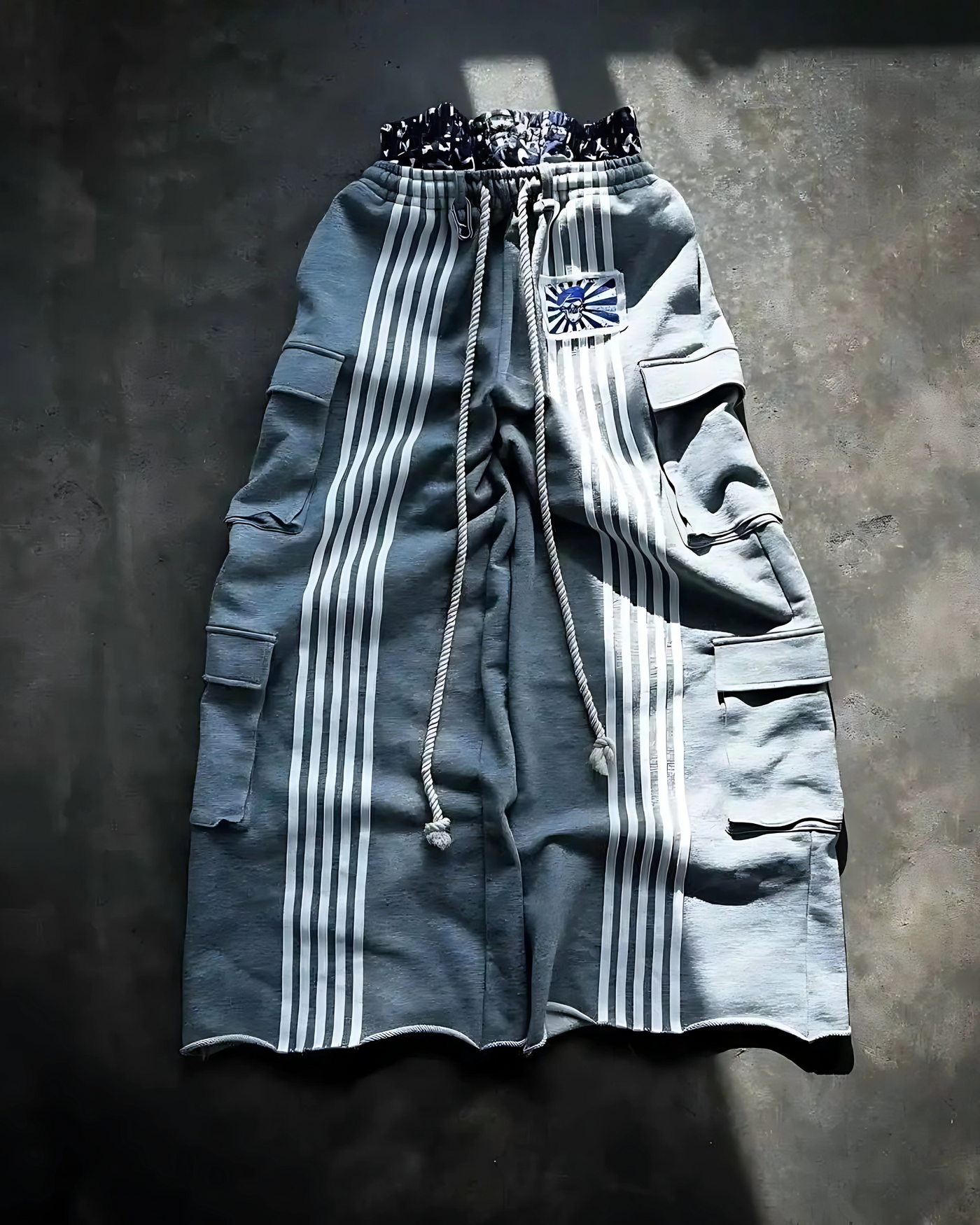 These oversized utility cargo pants deliver a bold fusion of retro athletic stripes and streetwear edge. Designed with exaggerated wide legs, heavy rope drawstring, and large side cargo pockets, they balance functional details with a loud, rebellious vibe. The standout multi-stripe design runs vertically down the legs, finished with a rising sun patch detail that gives each colorway a punch of attitude.