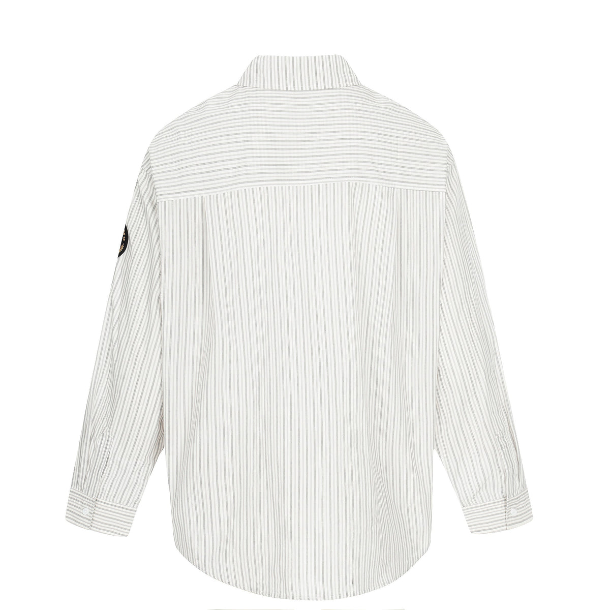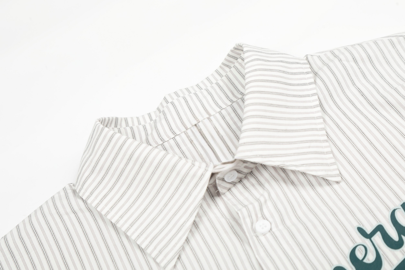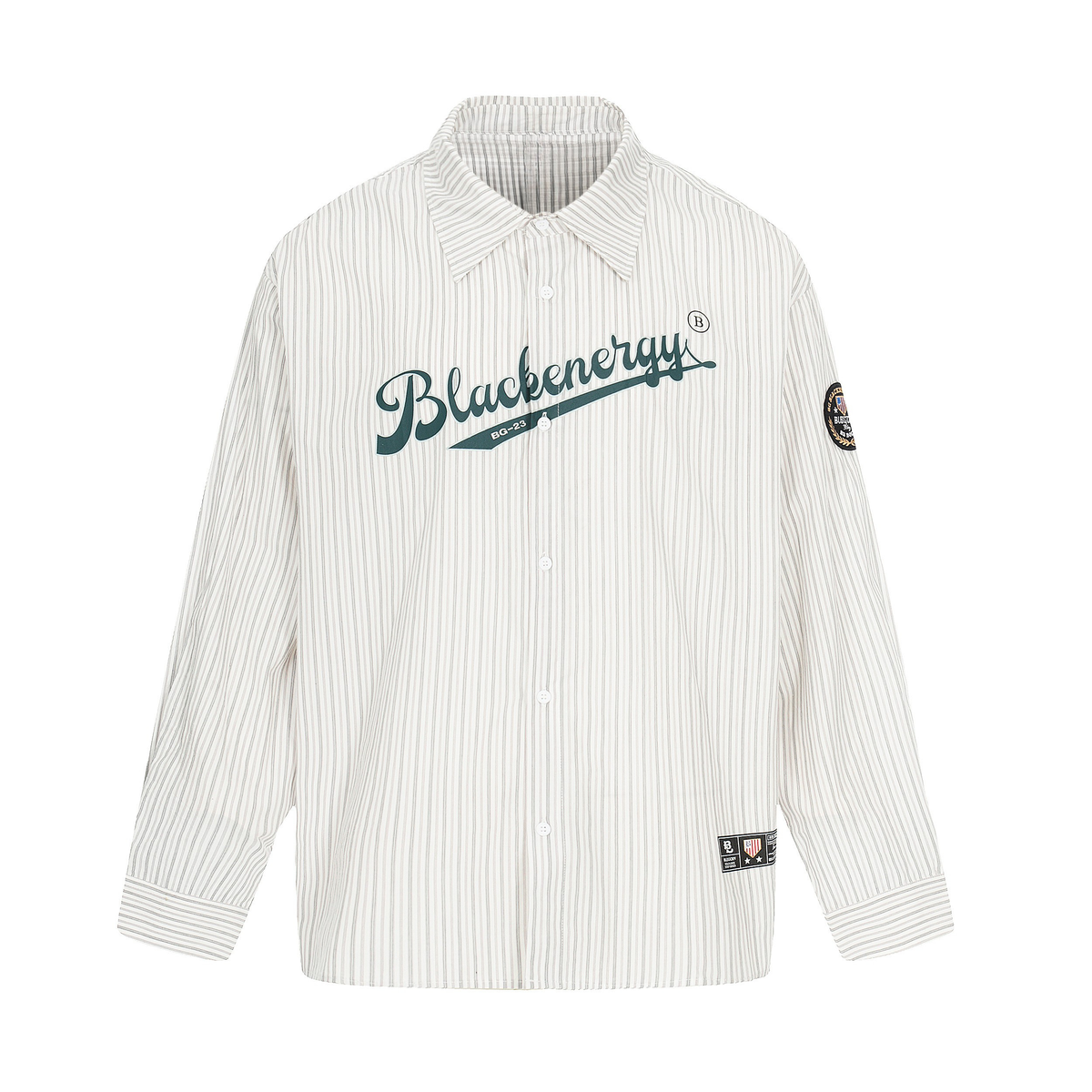 Clothing details: Long sleeve construction, button-up front closure, classic collar design, vertical stripe pattern, logo graphic detail, relaxed fit, curved hem finish.