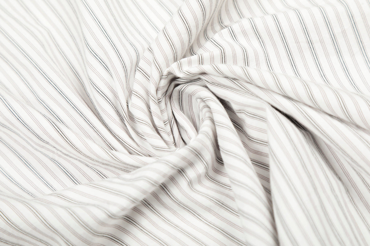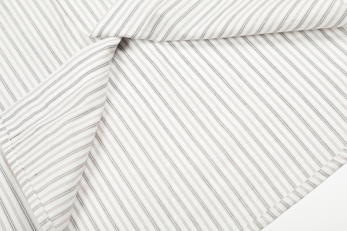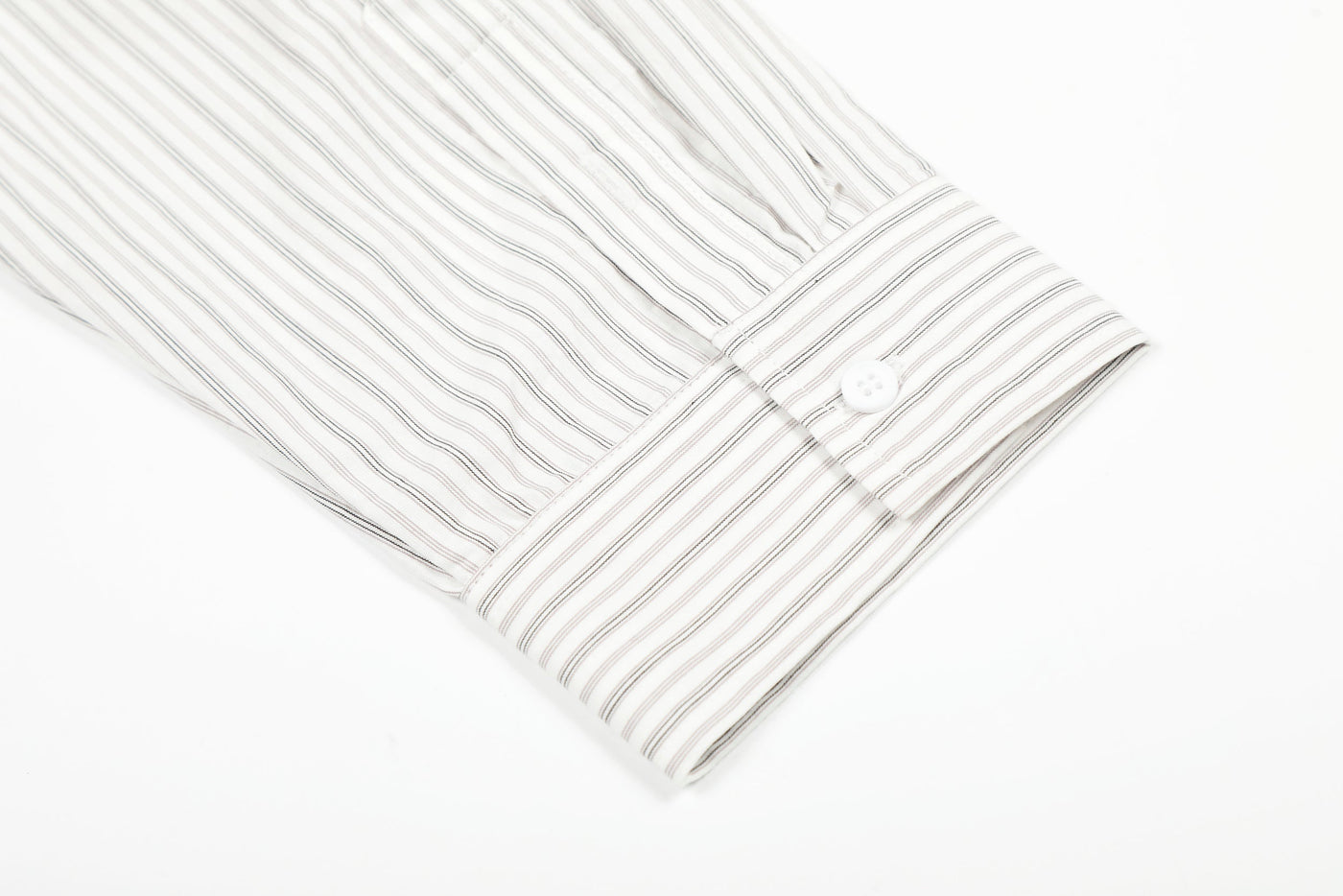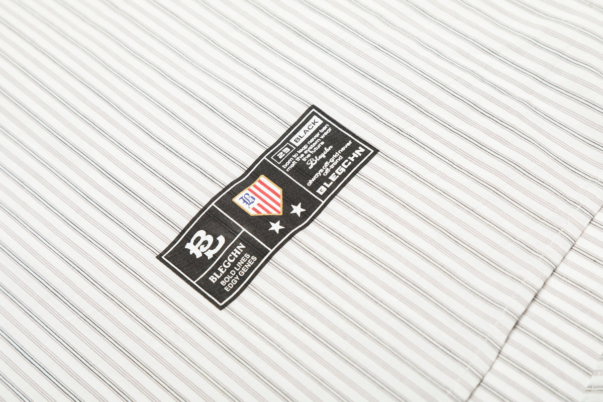 Clothing details: Long sleeve construction, button-up front closure, classic collar design, vertical stripe pattern, logo graphic detail, relaxed fit, curved hem finish.