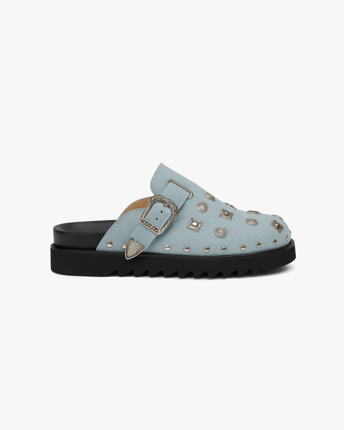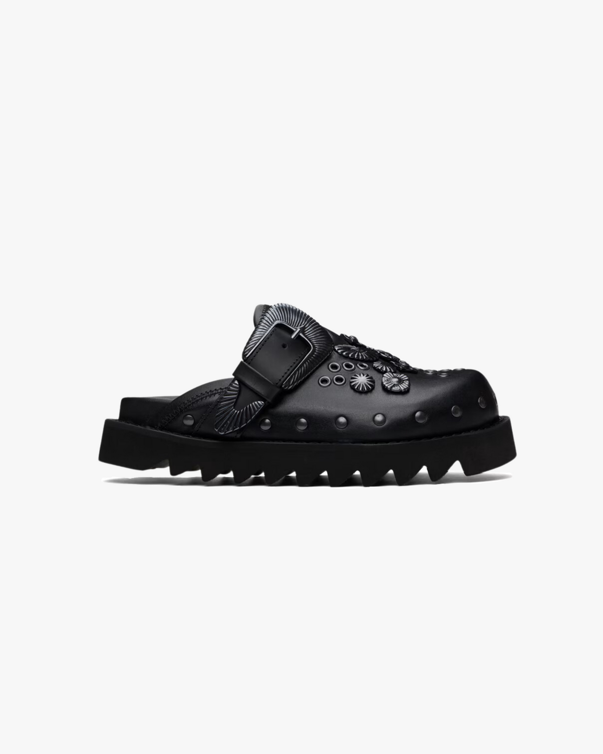 Crafted with calf leather, a silver-tone buckle, open-toe construction, and ridged rubber soles, the Roma slip-on leather sandals offer black and silver detailing.