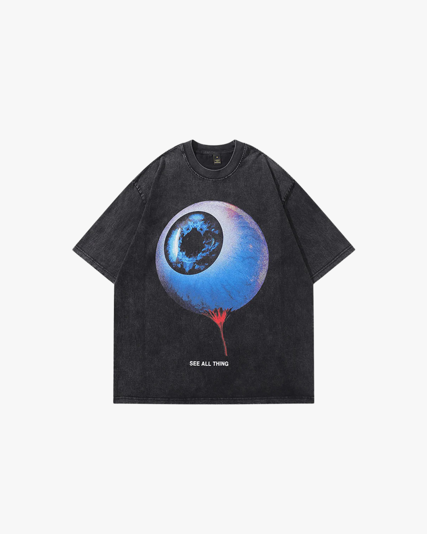Graphic: Bold eyeball print with “SEE ALL THING” text