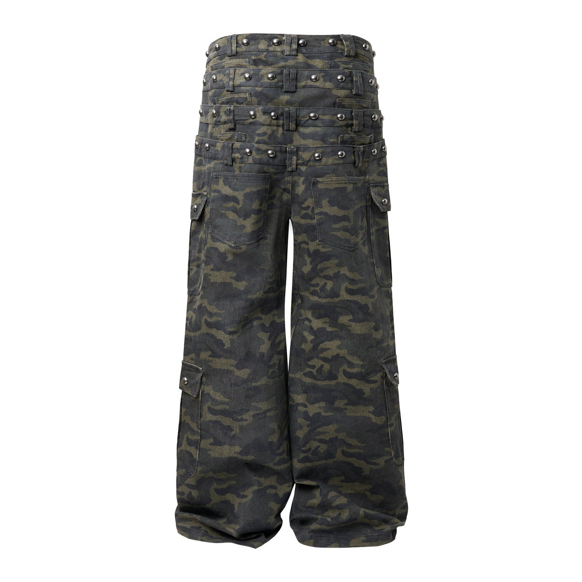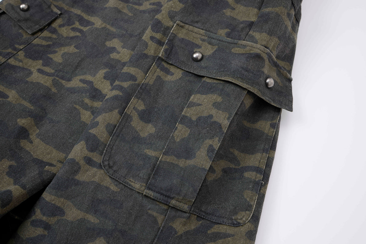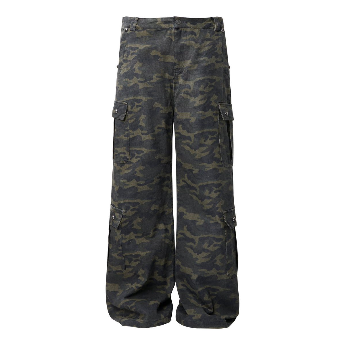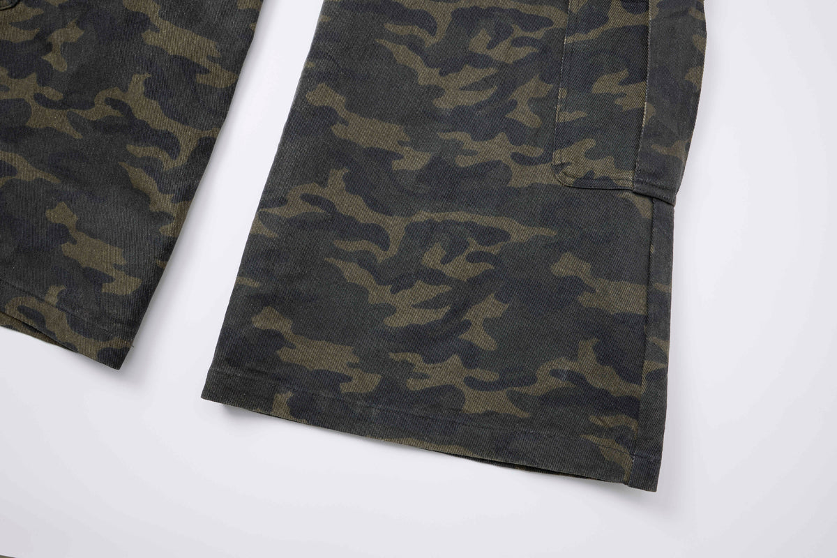 Clothing details: All-over camouflage print, multiple cargo pockets with flap closures, structured waistband with belt loops, wide-leg silhouette, durable cotton construction, relaxed fit designed for street and utility wear.