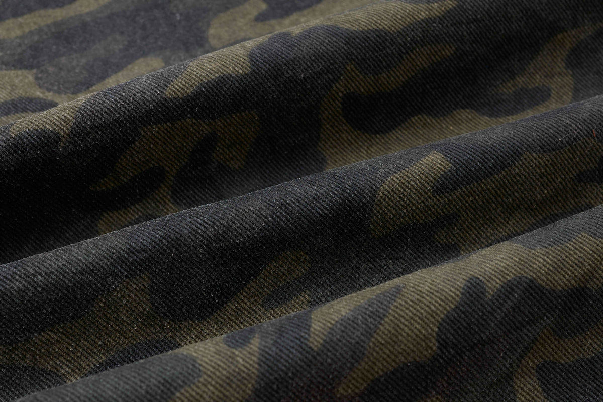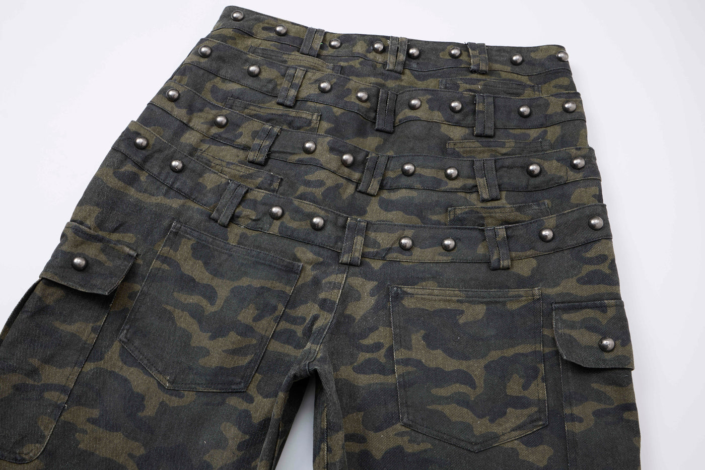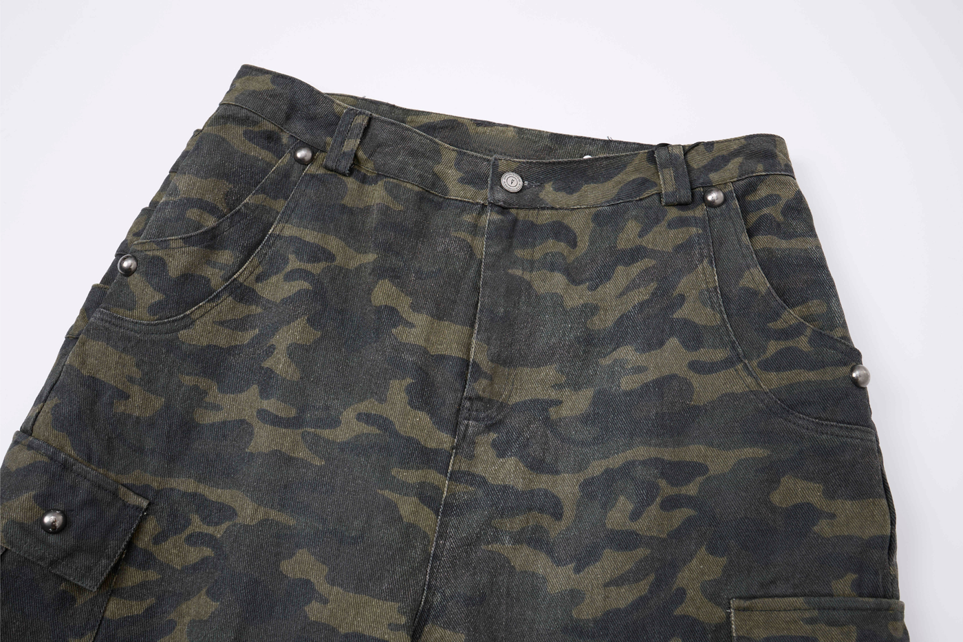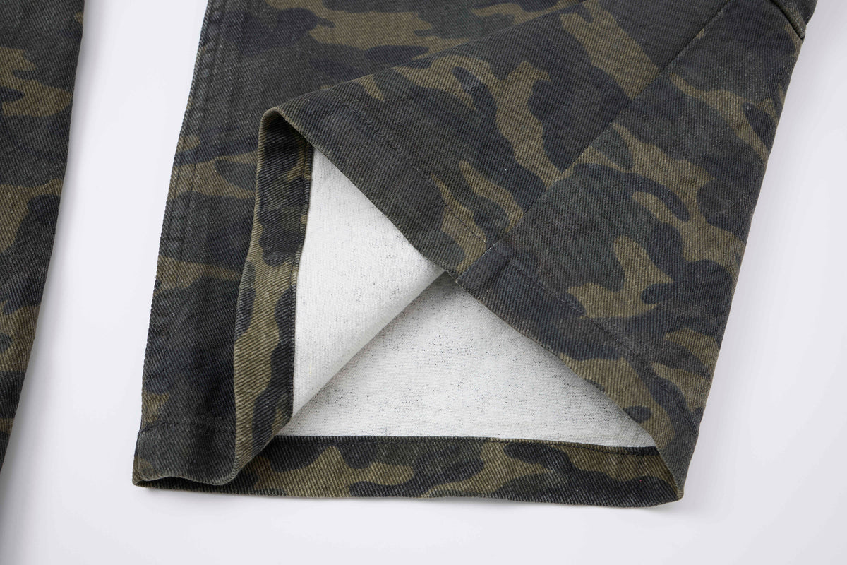 Clothing details: All-over camouflage print, multiple cargo pockets with flap closures, structured waistband with belt loops, wide-leg silhouette, durable cotton construction, relaxed fit designed for street and utility wear.