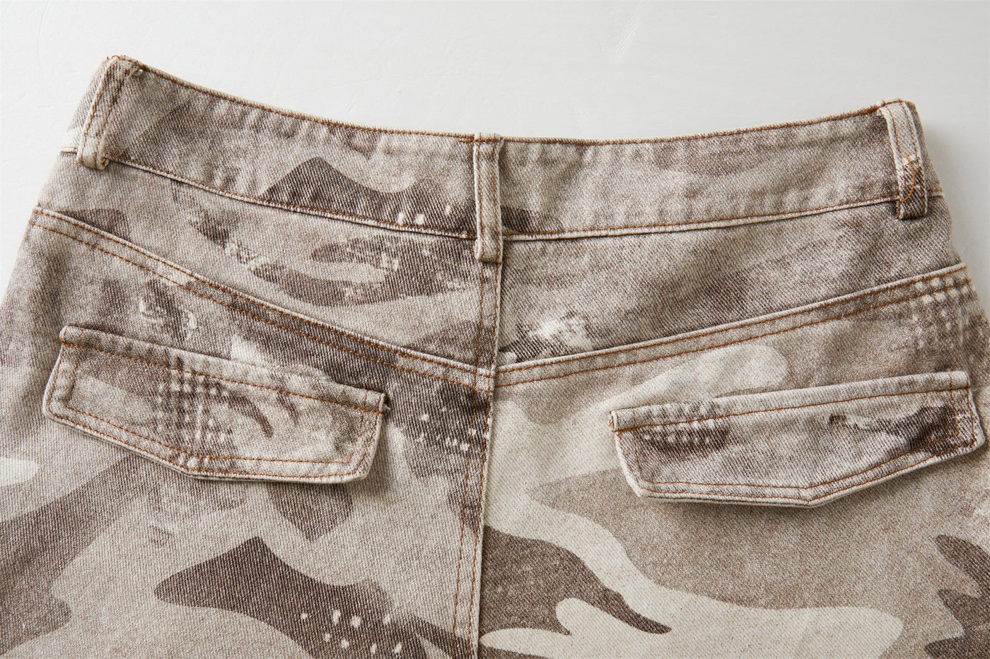 Clothing details: Camouflage pattern, cargo pocket detailing, wide-leg fit, classic waistband construction