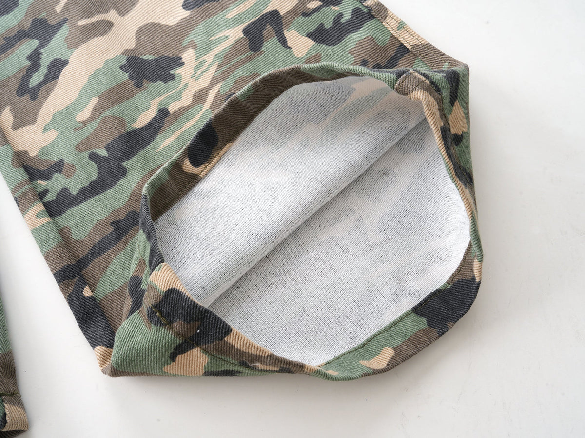 Clothing details: All-over camouflage print, wide-leg relaxed fit, large flap cargo pockets, mid-rise waist, classic button closure, durable yet breathable fabric, utility-inspired design, everyday streetwear essential.