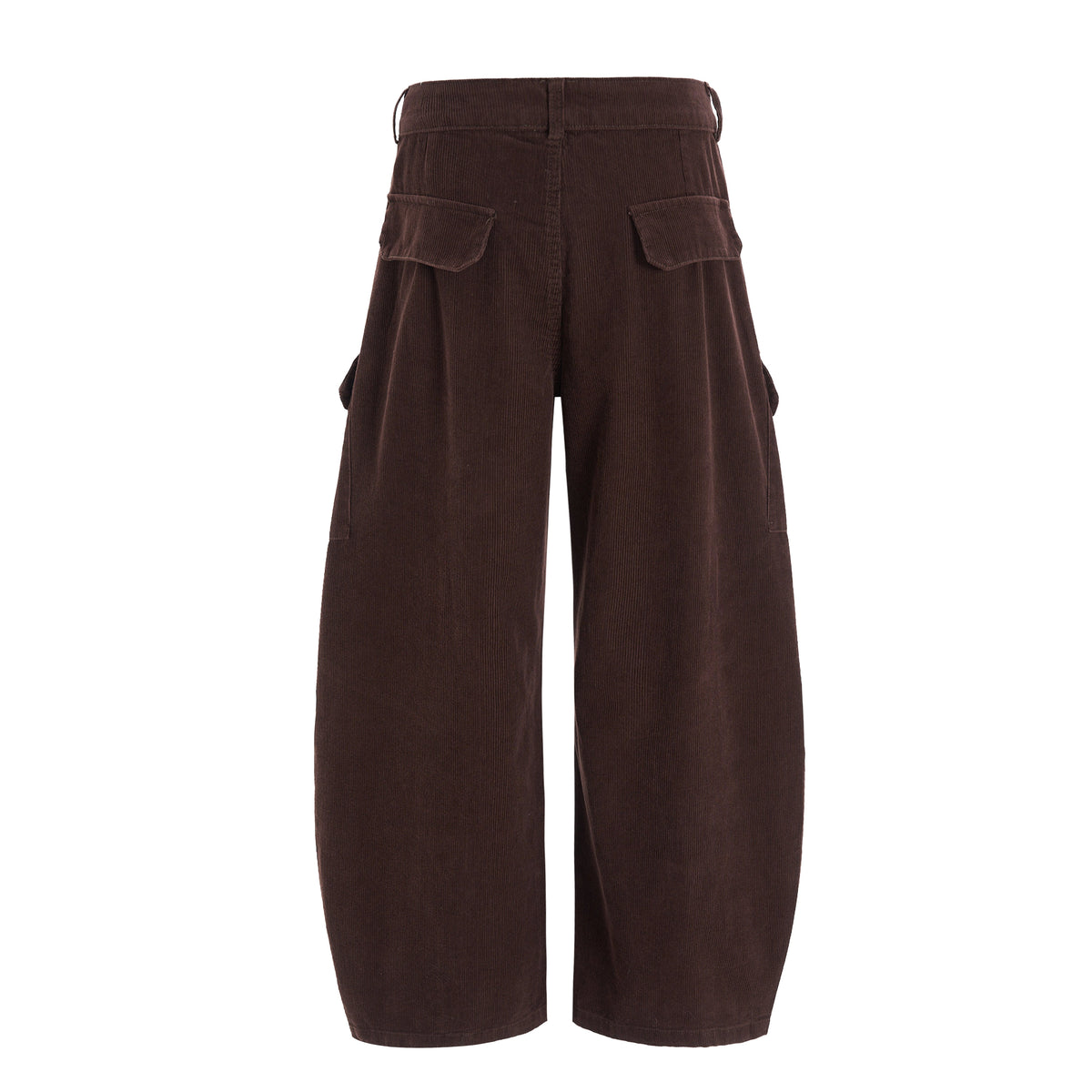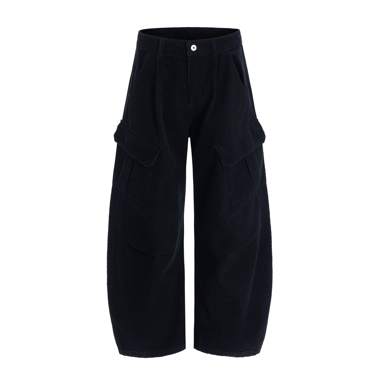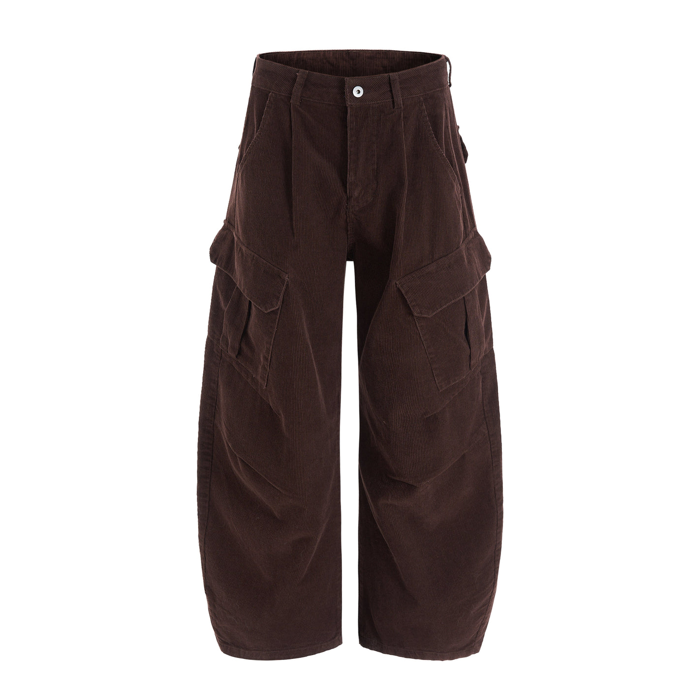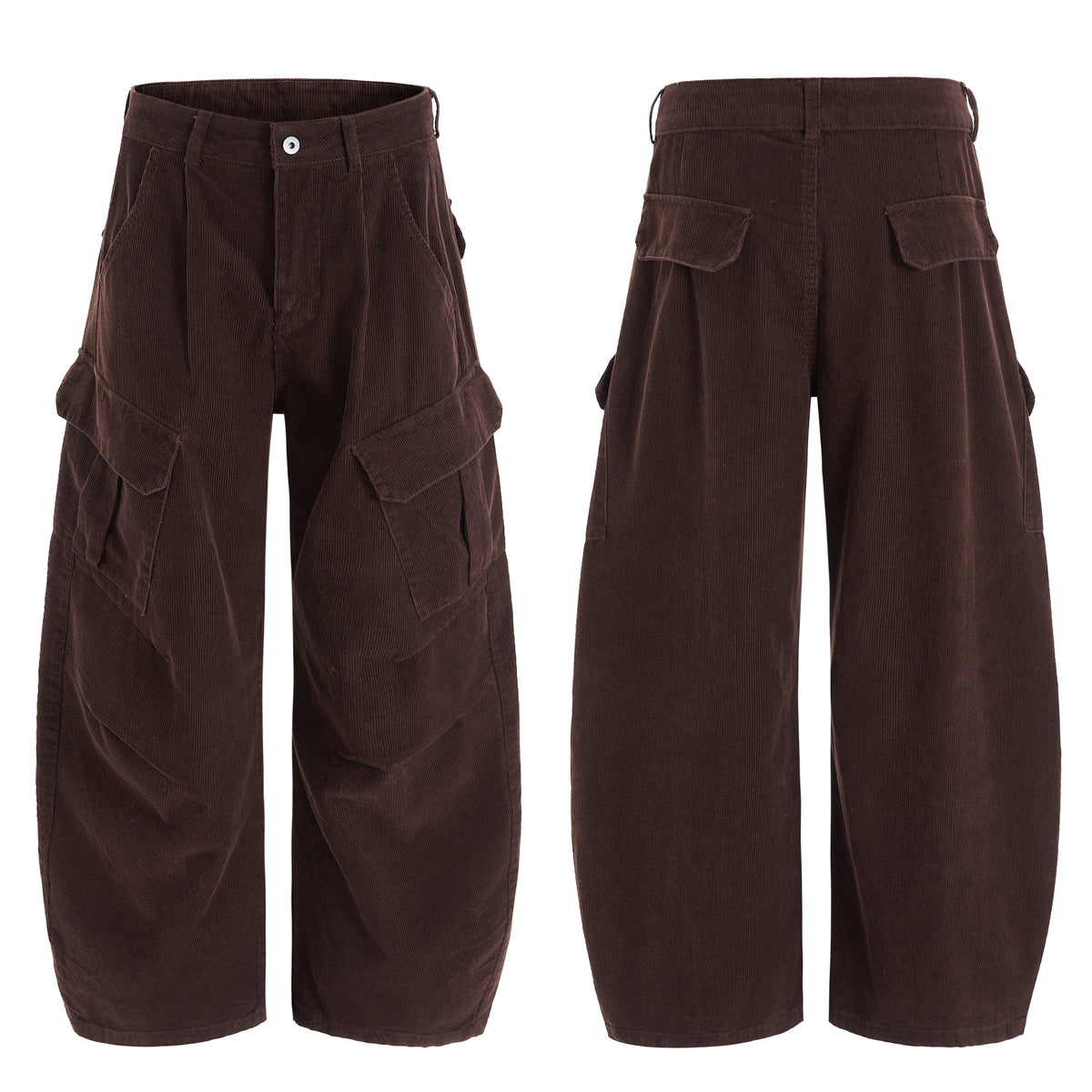 Clothing details: Corduroy fabric construction, wide-leg fit, functional cargo pockets, structured panel design, reinforced waistband with belt loops, durable cotton build.