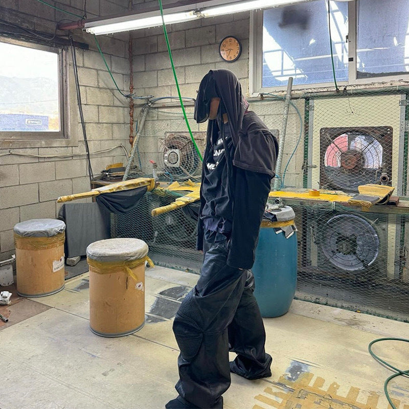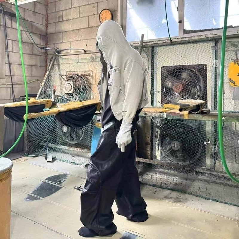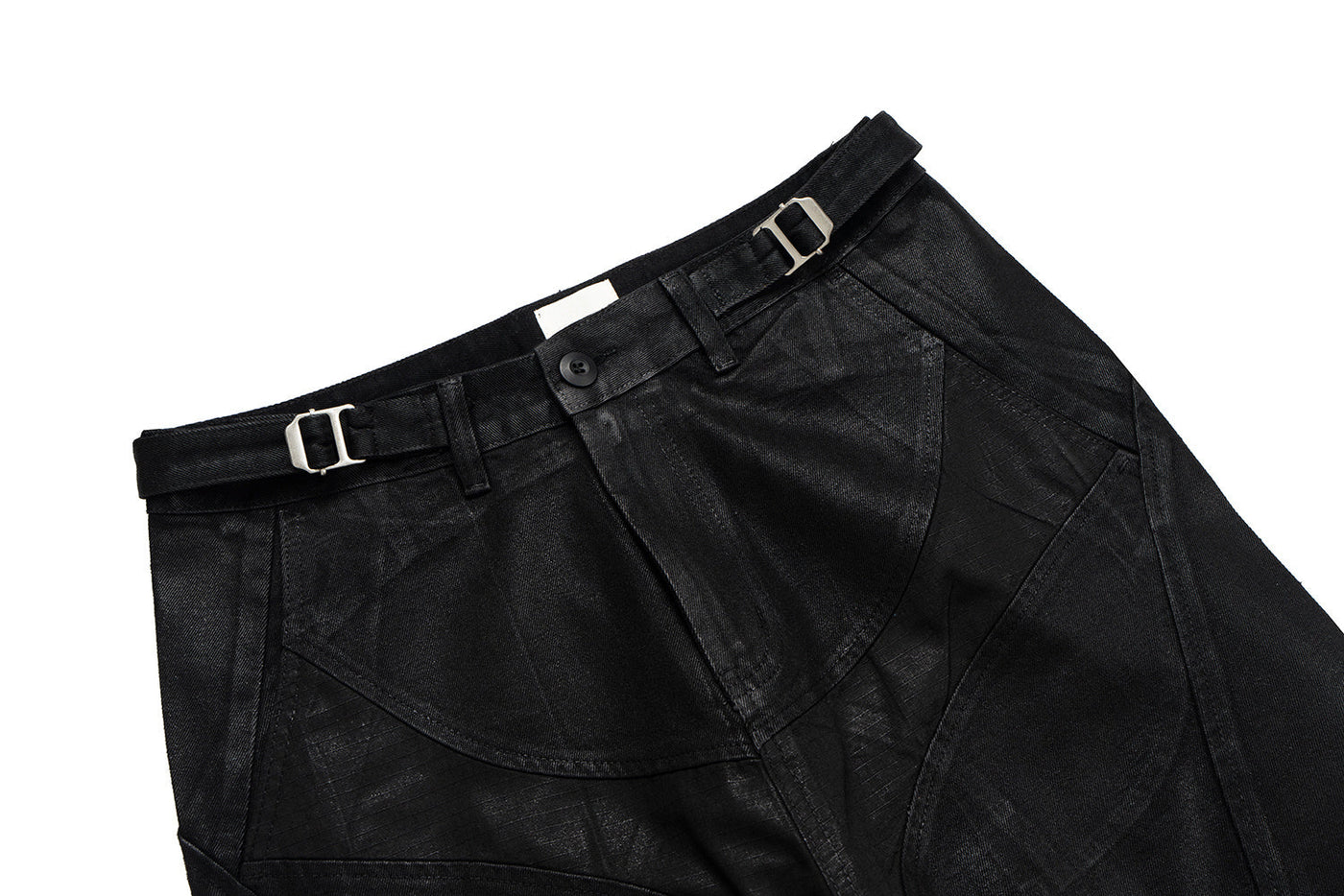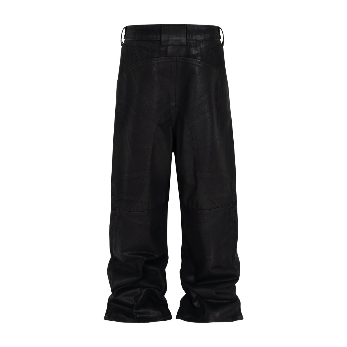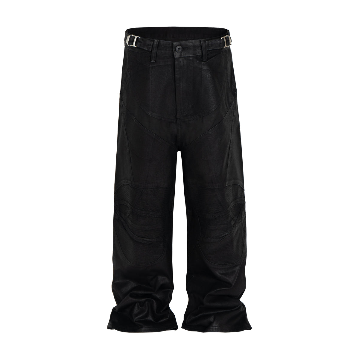 Clothing details: Curved stitched panels, leather-textured coating, metal waist adjusters, stacked wide-leg fit, structured silhouette