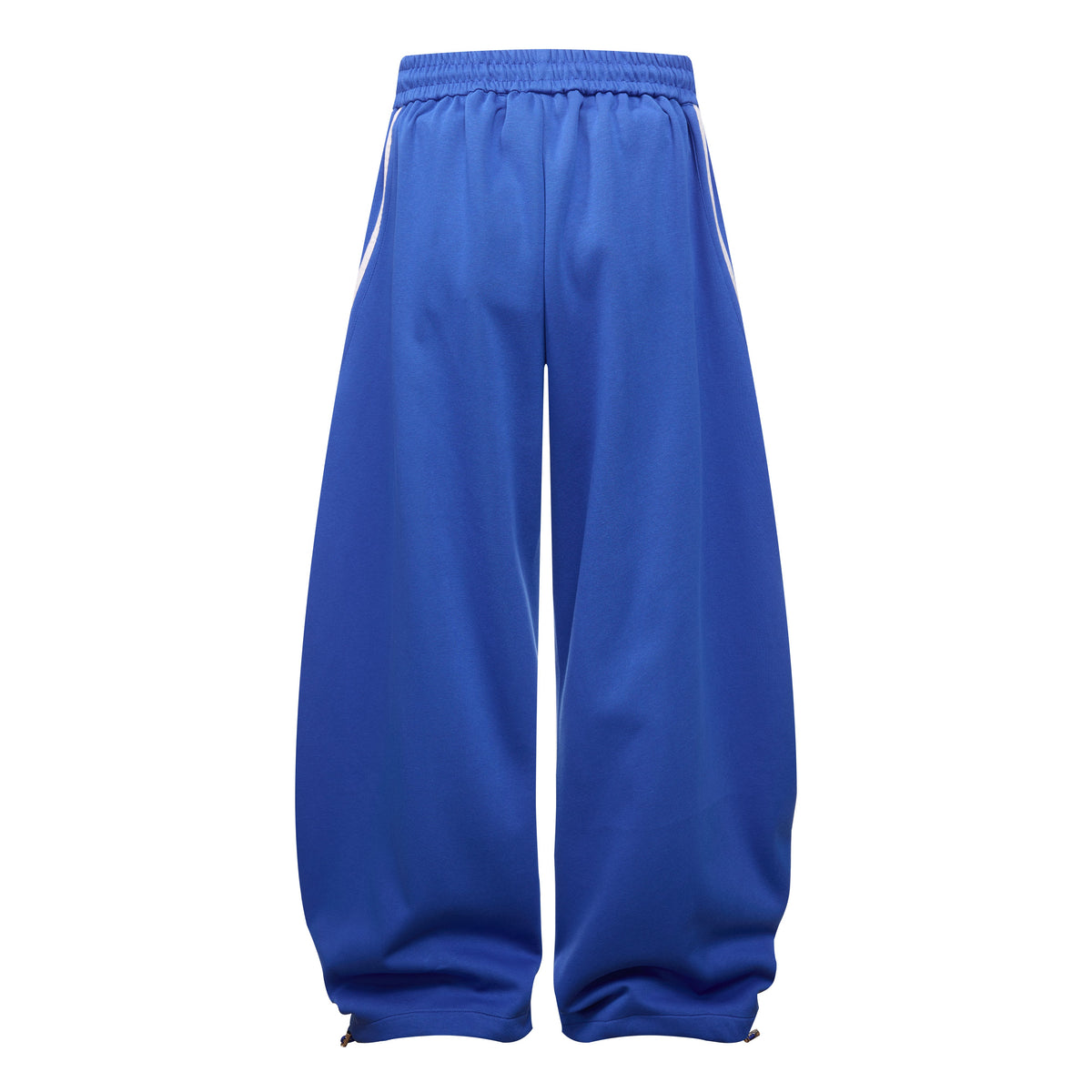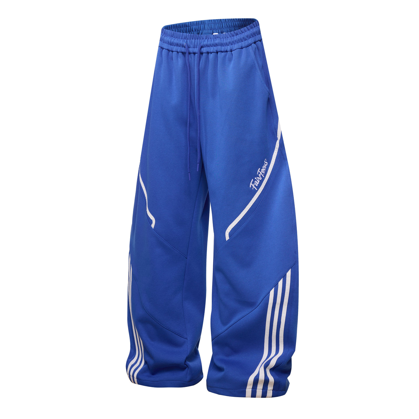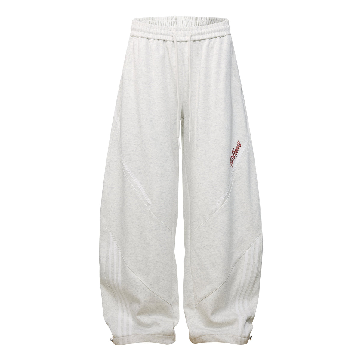 Clothing details: Curved-panel construction, triple-stripe detail, embroidered logo, drawstring waist, wide stacked fit.
