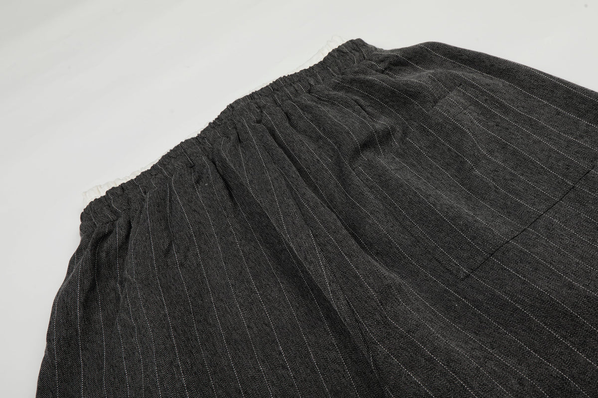 Clothing details: Elastic waistband with drawstring, vertical pinstripe pattern, wide-leg silhouette, relaxed fit, breathable cotton fabric, minimal logo detail, designed for all-day comfort and versatile styling.