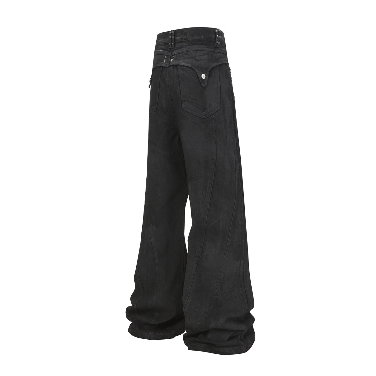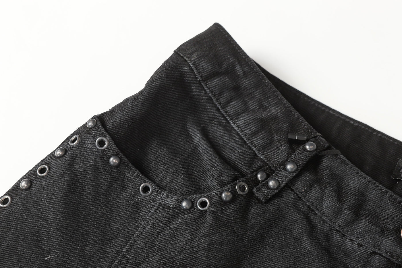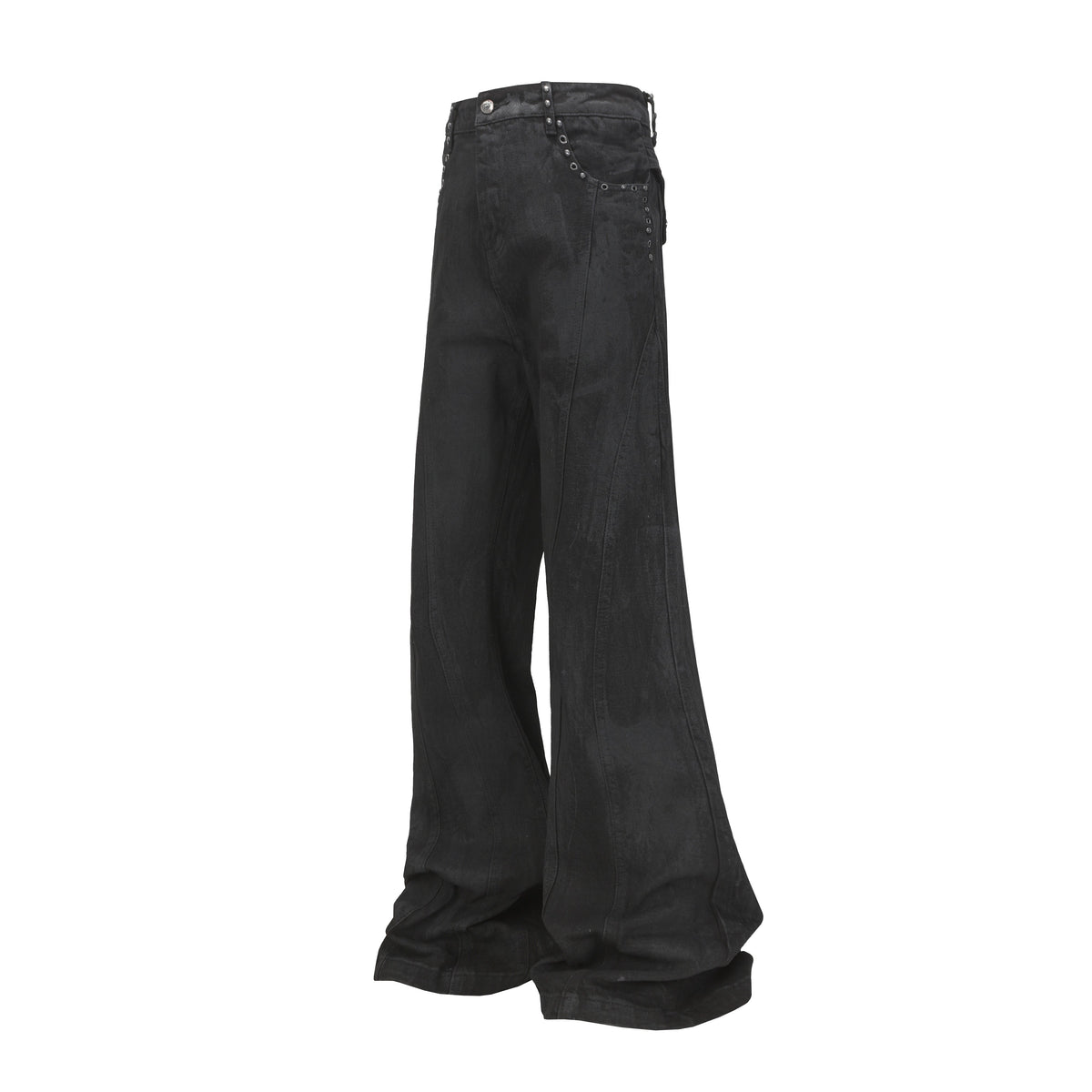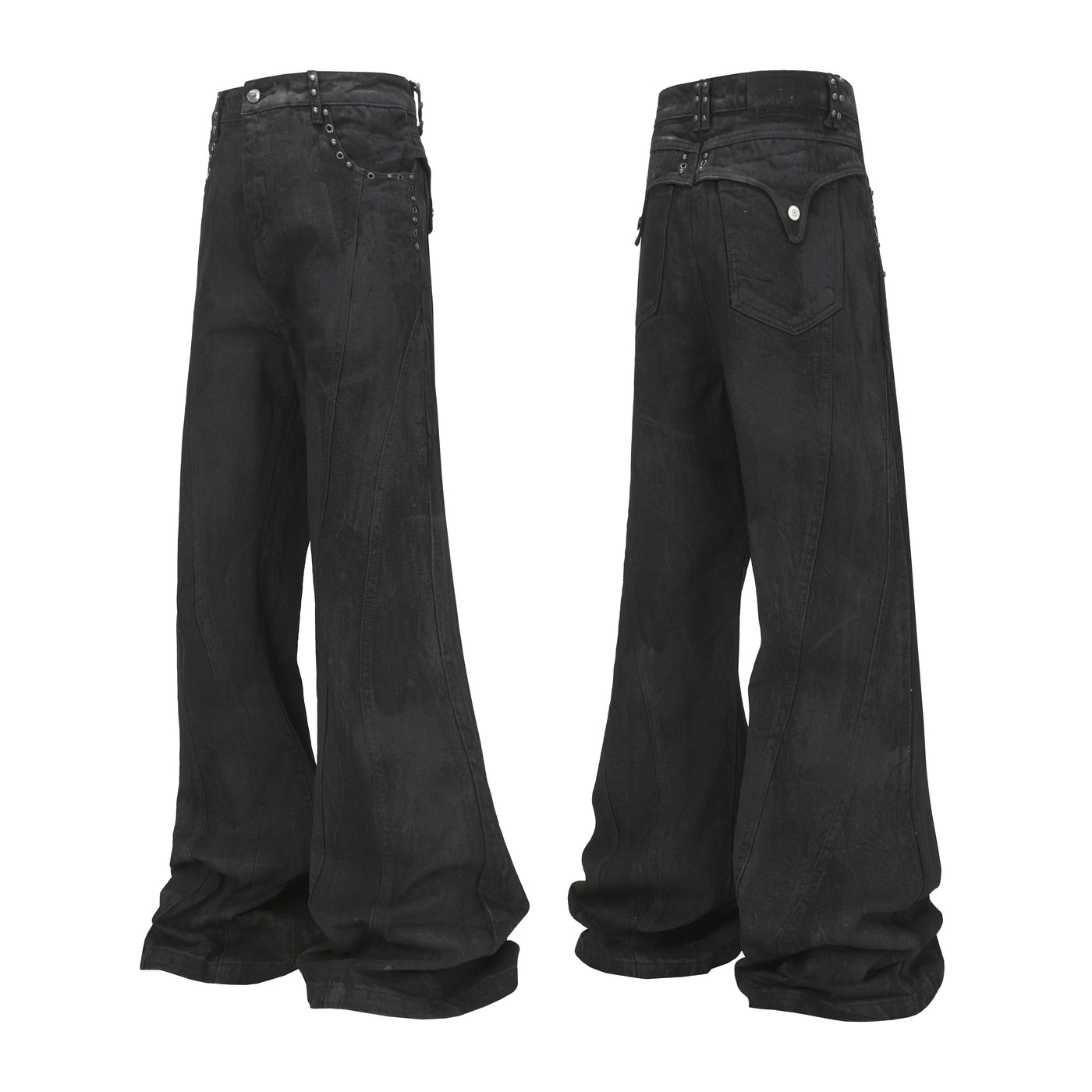 The Omirad Studded Panel Wide-Leg Jeans channel a dark, industrial streetwear aesthetic with subtle metal rivet detailing and sculpted seam panels. The exaggerated wide-leg silhouette and washed black finish give these jeans a heavy drape and underground attitude—made to stand out with minimal styling.