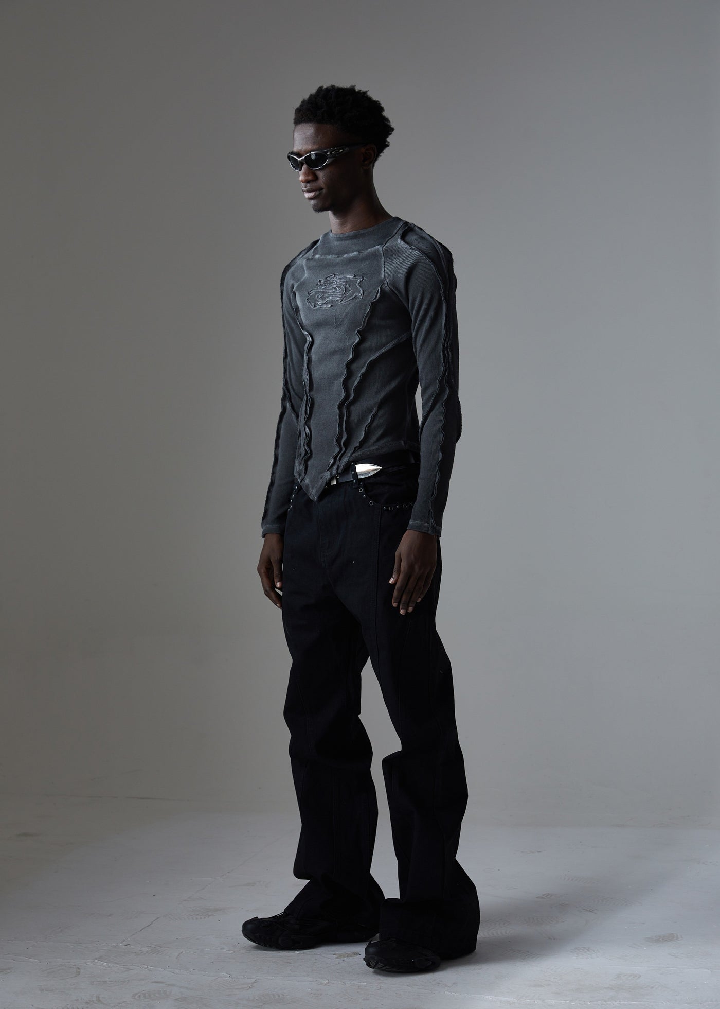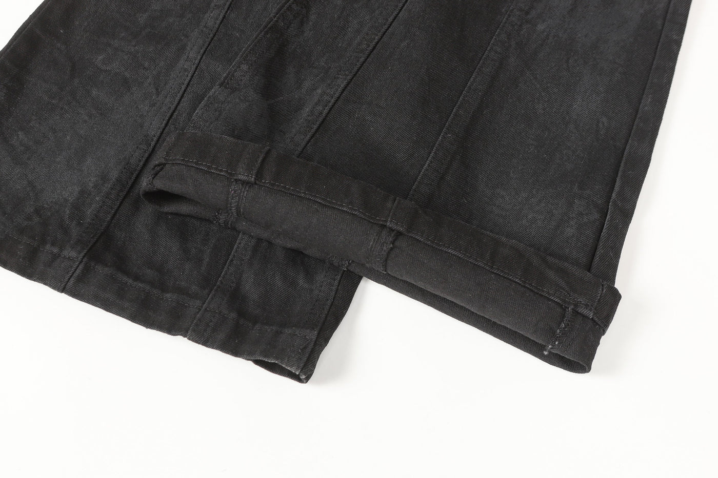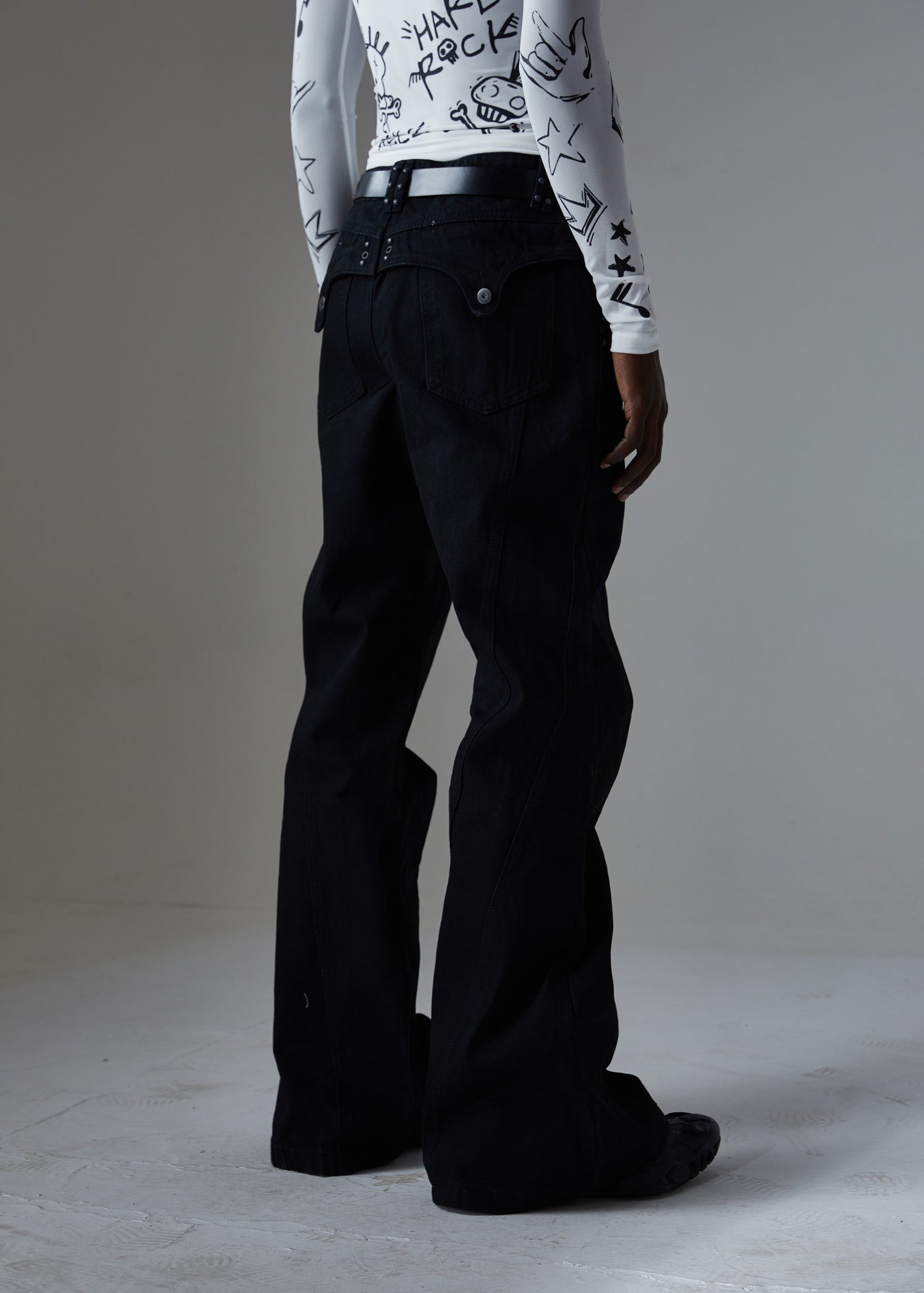 The Omirad Studded Panel Wide-Leg Jeans channel a dark, industrial streetwear aesthetic with subtle metal rivet detailing and sculpted seam panels. The exaggerated wide-leg silhouette and washed black finish give these jeans a heavy drape and underground attitude—made to stand out with minimal styling.