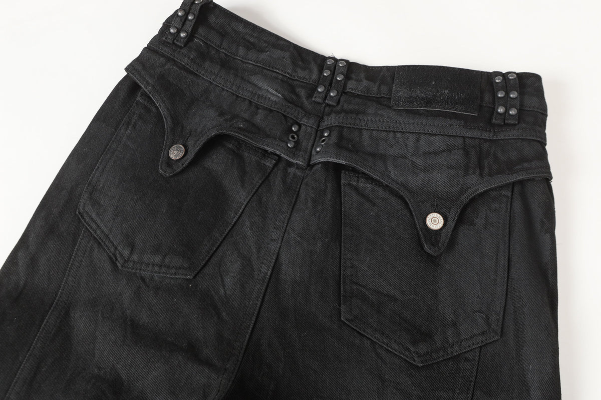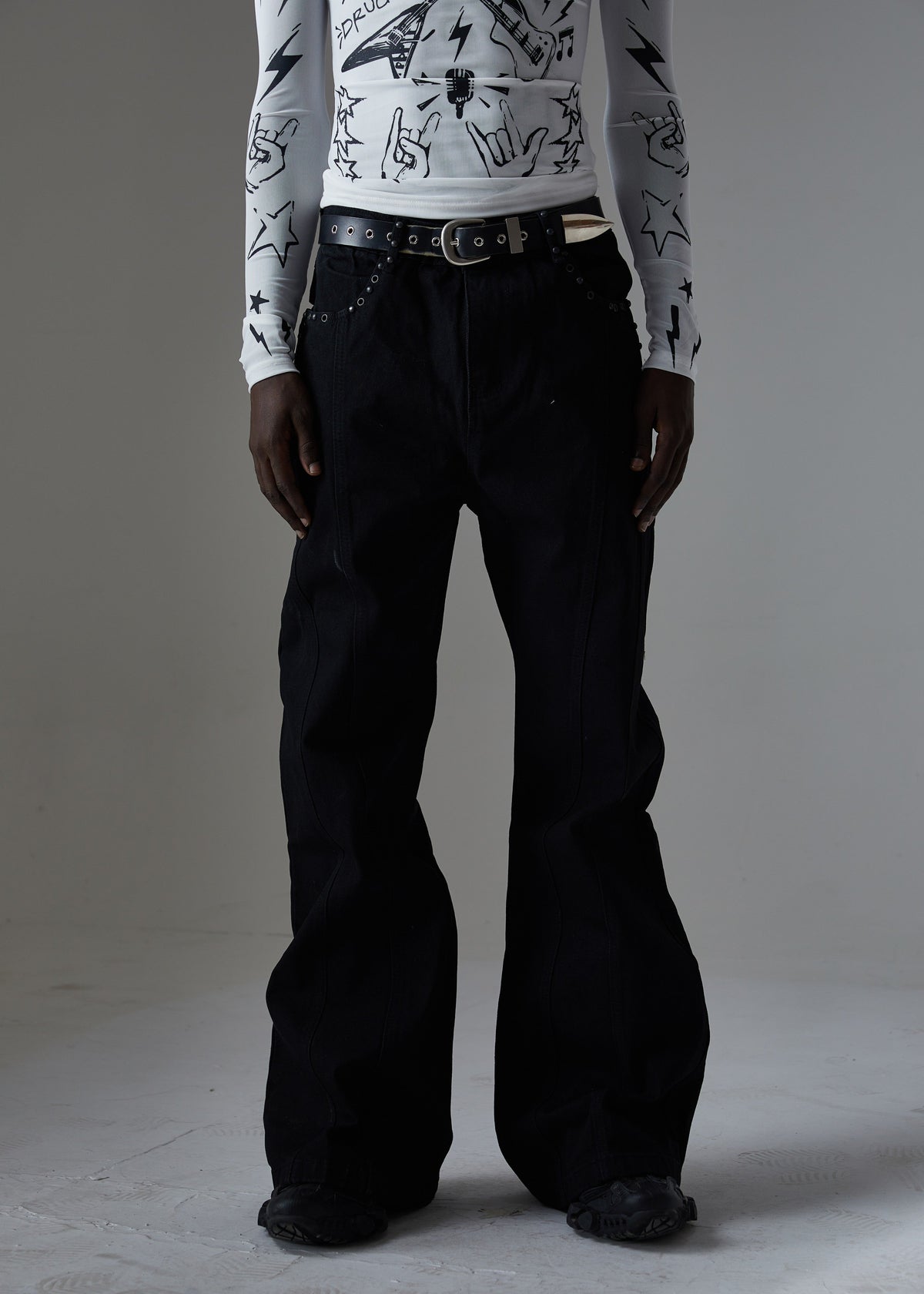 Clothing details: Washed black denim finish, metal stud and rivet accents, curved panel seam construction, wide-leg silhouette, structured heavyweight cotton denim, classic five-pocket layout, relaxed stacked fit at the hem.