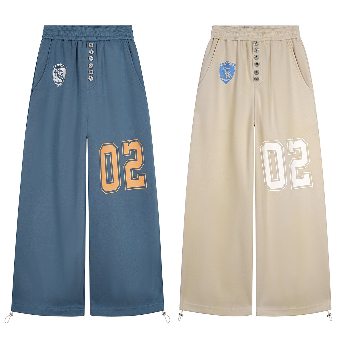 The Omirad Varsity Number Wide-Leg Pants feature a clean athletic-inspired design highlighted by bold “02” varsity-style graphics and a refined crest detail. Designed with a relaxed wide-leg silhouette, buttoned placket front, and adjustable waistband, they deliver a perfect balance of comfort and structured streetwear style for everyday wear.
