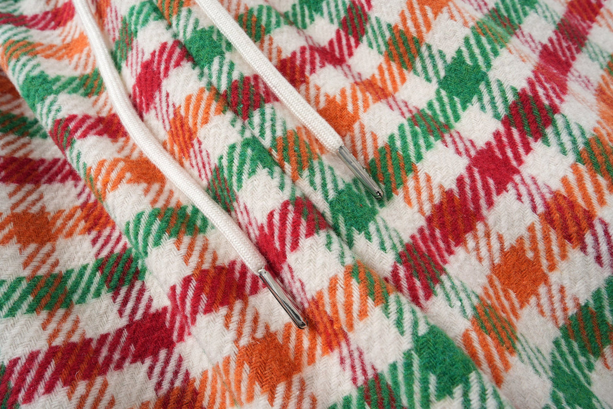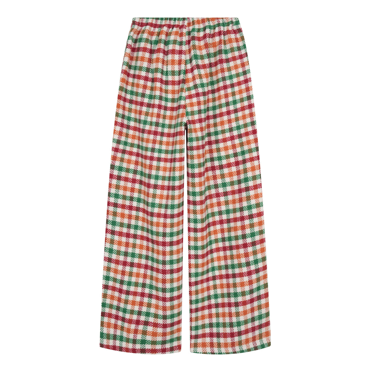 Clothing details: All-over plaid print, elastic waistband, adjustable drawstring, wide-leg silhouette, lightweight structured feel, relaxed fit