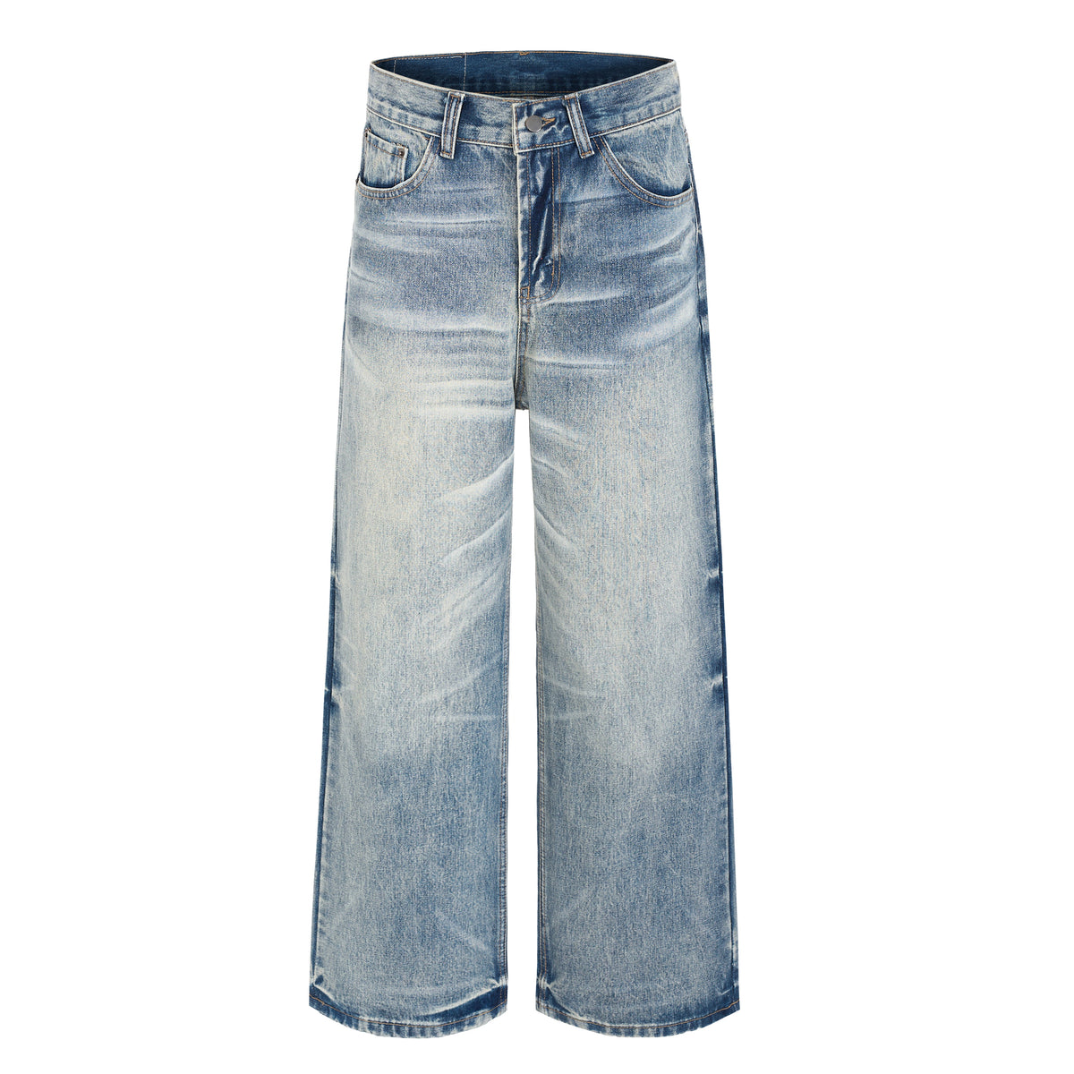 Clothing details: Vintage washed denim, wide-leg fit, natural fade and whisker detailing, classic five-pocket construction, reinforced waistband with belt loops, durable heavyweight cotton denim.