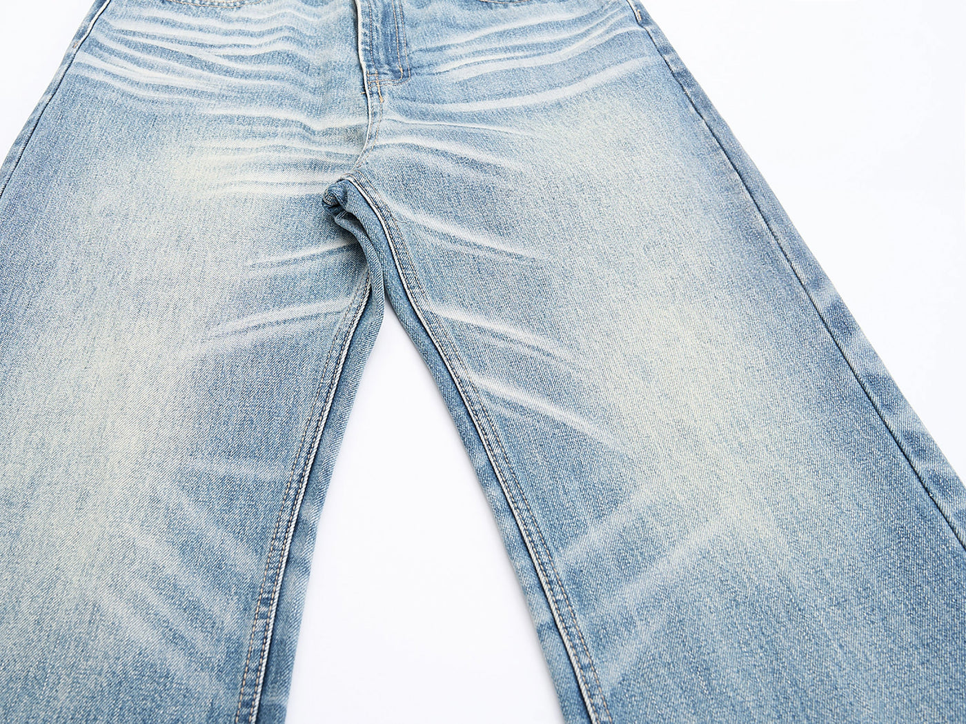 Clothing details: Washed denim finish, wide-leg fit, pronounced whisker detailing, gradient fade effect, classic five-pocket construction, reinforced waistband with belt loops, durable cotton denim fabric.