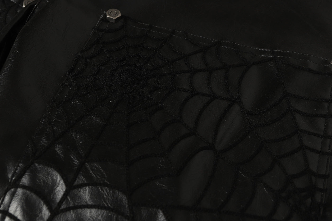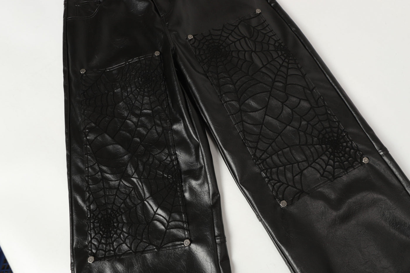 Clothing details: Spider-web embossed panels, faux-leather shell, wide-leg fit, stacked silhouette, metal rivet accents.
