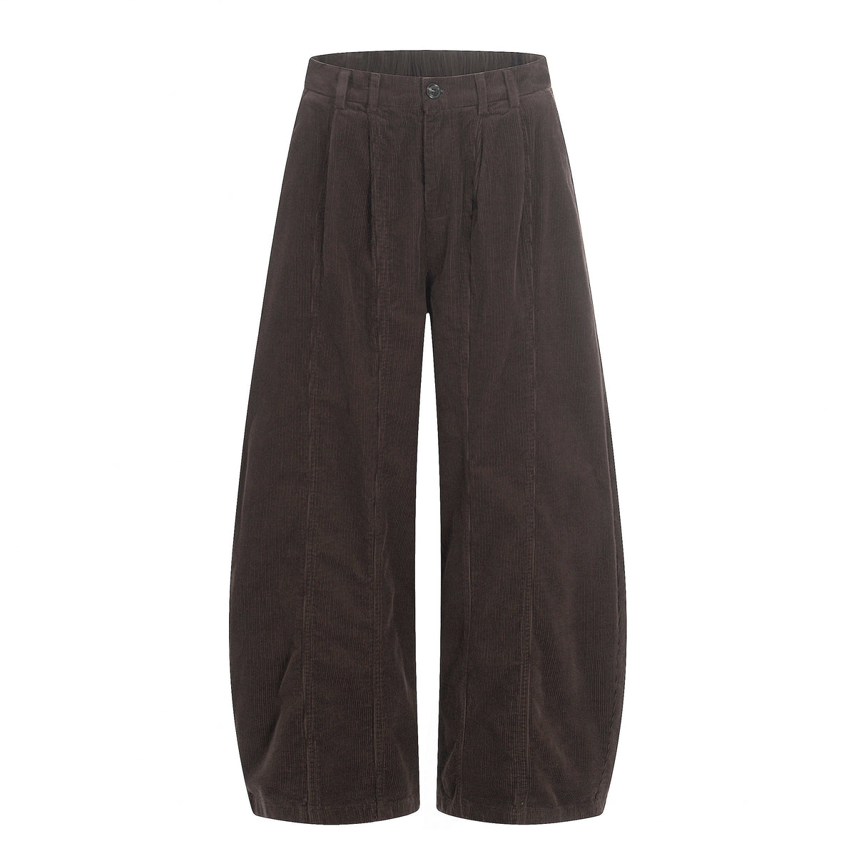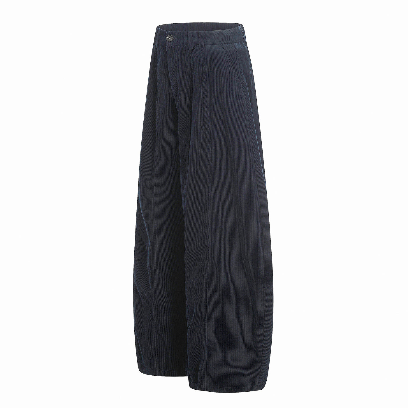 Clothing details: Wide-leg silhouette, corduroy textured fabric, structured waistband with button closure, subtle pleated front, clean straight drape, breathable cotton construction for all-day wear.