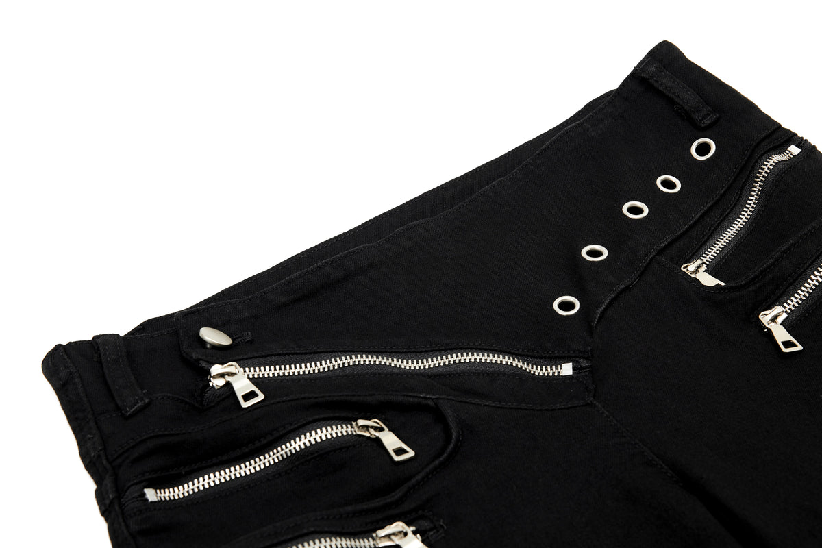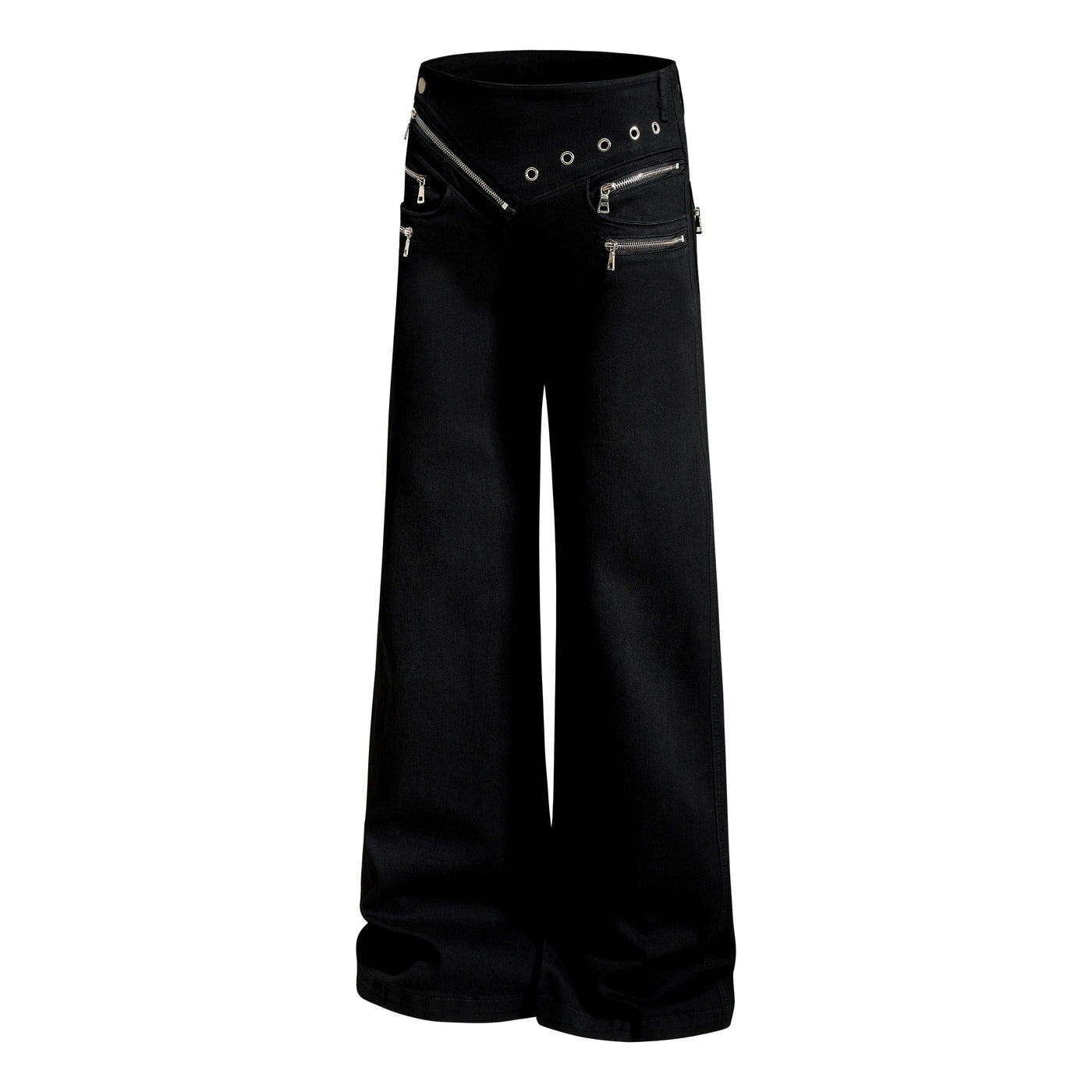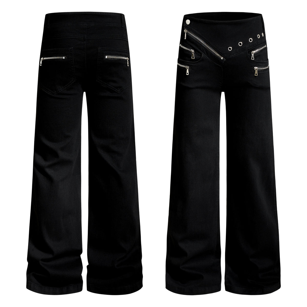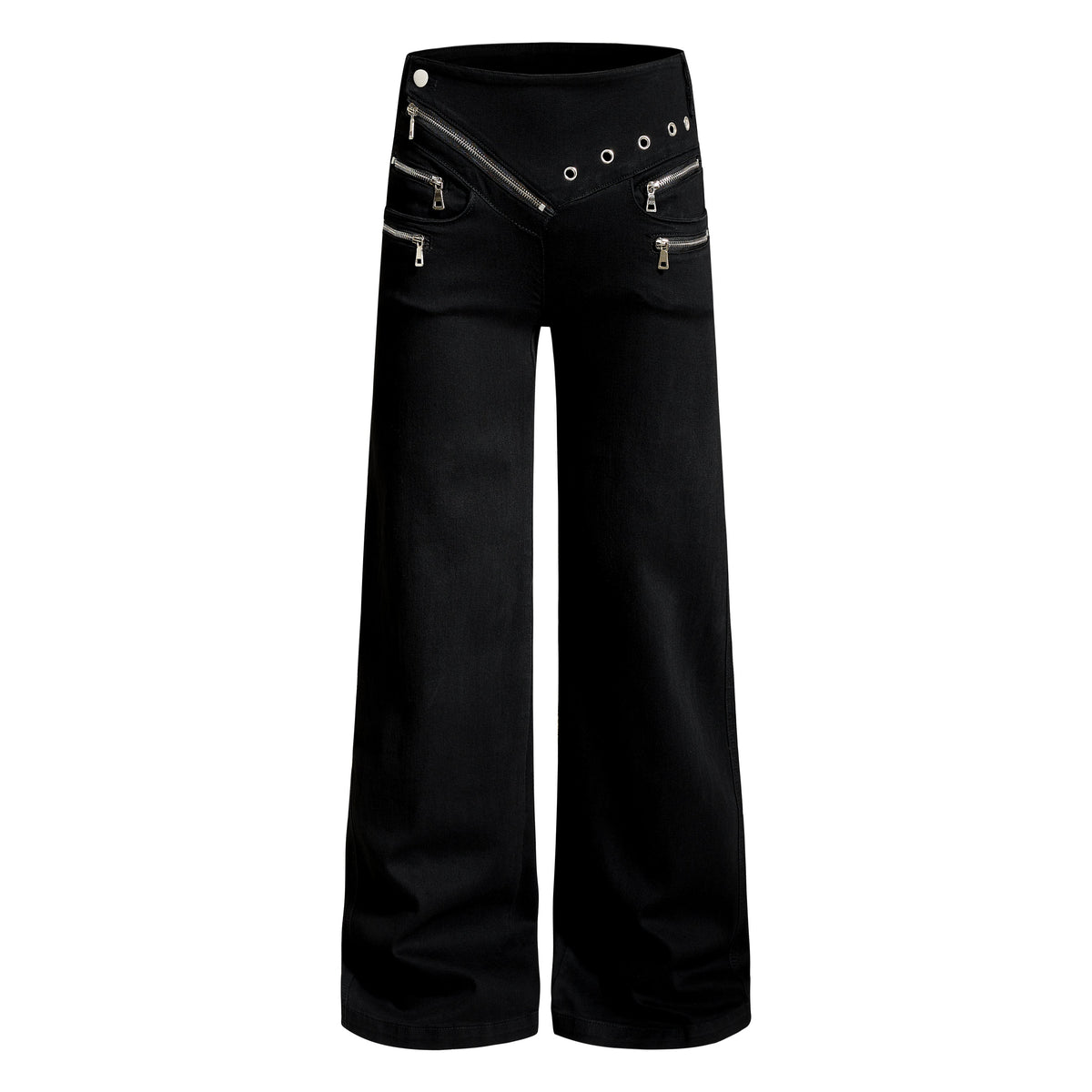 Clothing details: Asymmetrical waistband, zipper detailing, flared leg, metal eyelets, zip fly closure