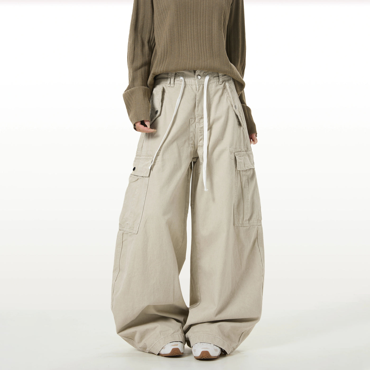 Clothing Details: Oversized barrel-leg cut, utility cargo pockets, drawstring waist and hem, washed texture, relaxed streetwear silhouette