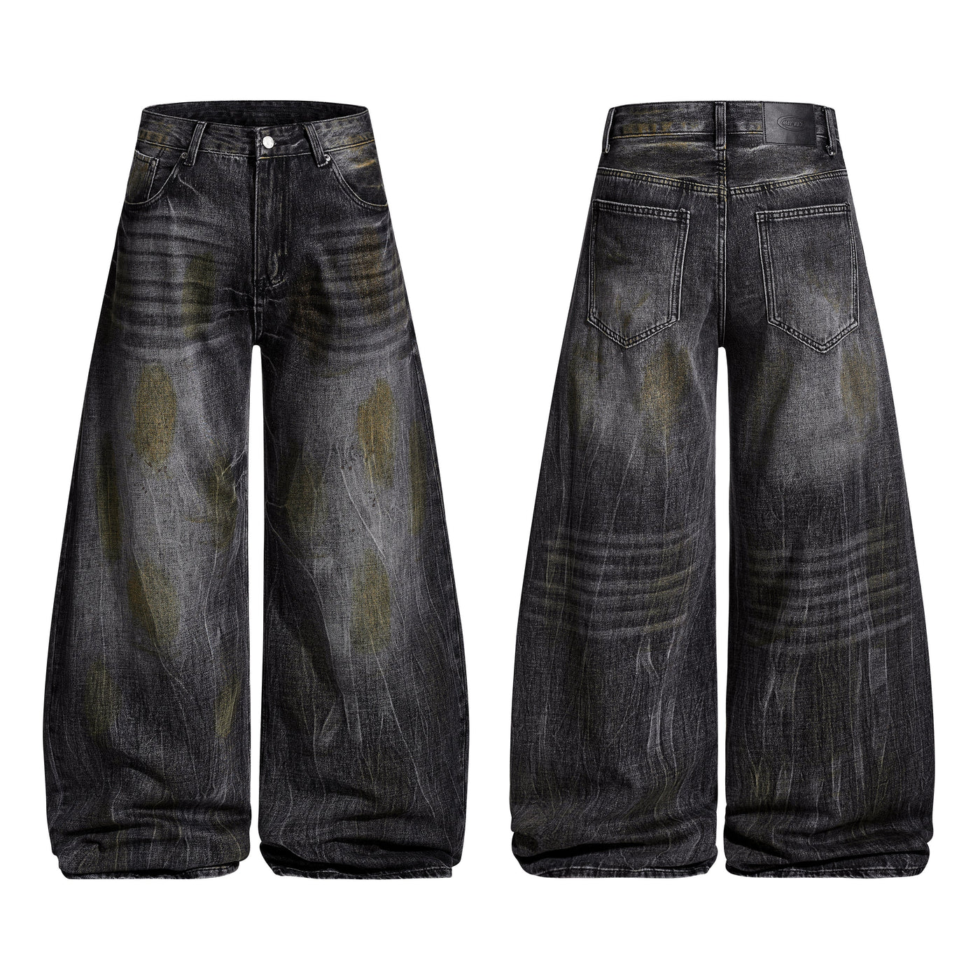Clothing details: Vintage brushed wash, curved wide-leg fit, structured silhouette, heavy fade detailing, mid-rise waist