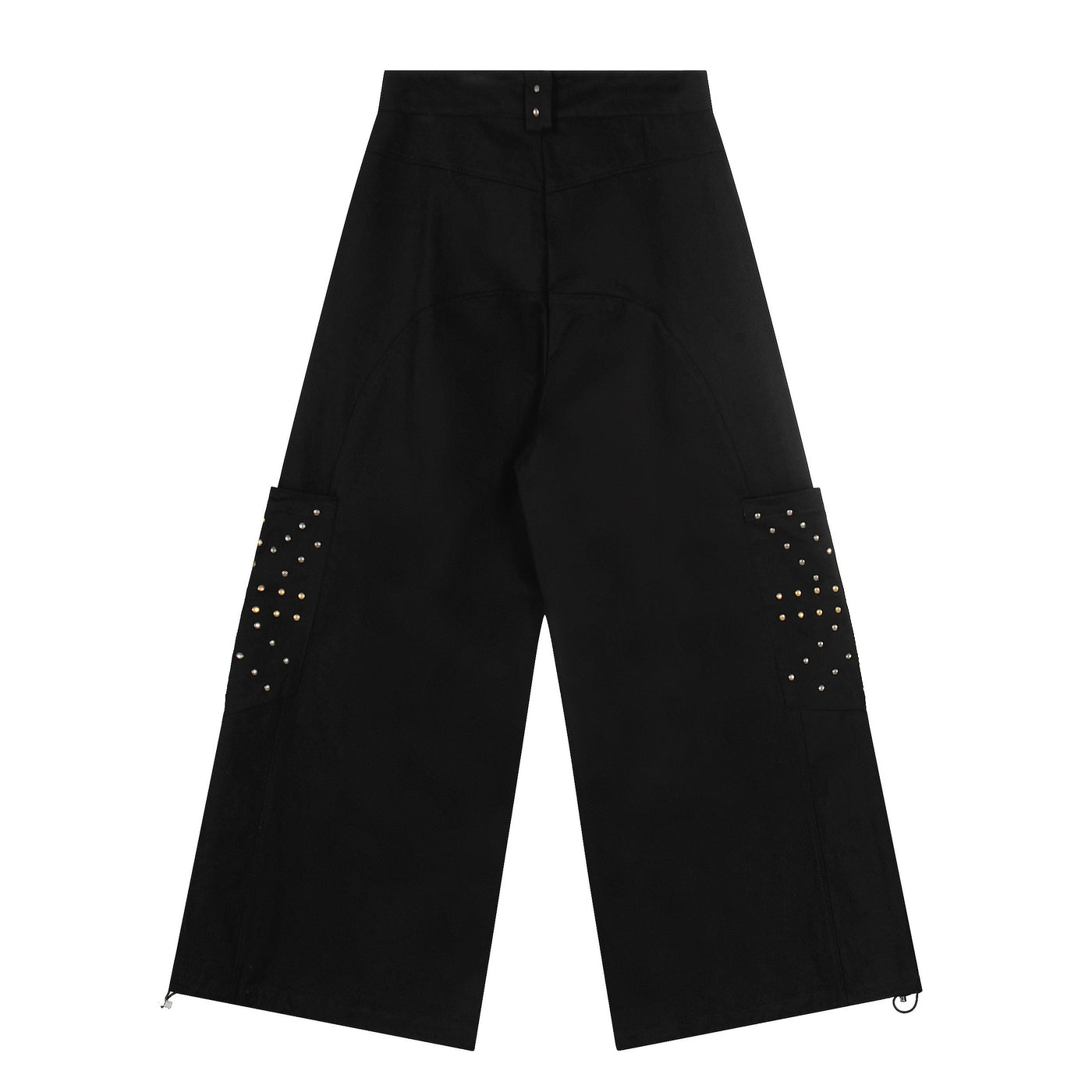 Clothing details: Metal stud embellishments, cargo pocket design, wide-leg fit, adjustable hem toggles, zip-fly closure with button fastening