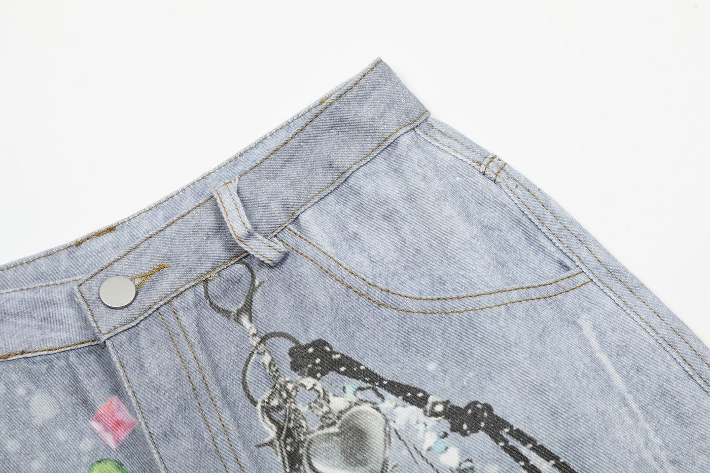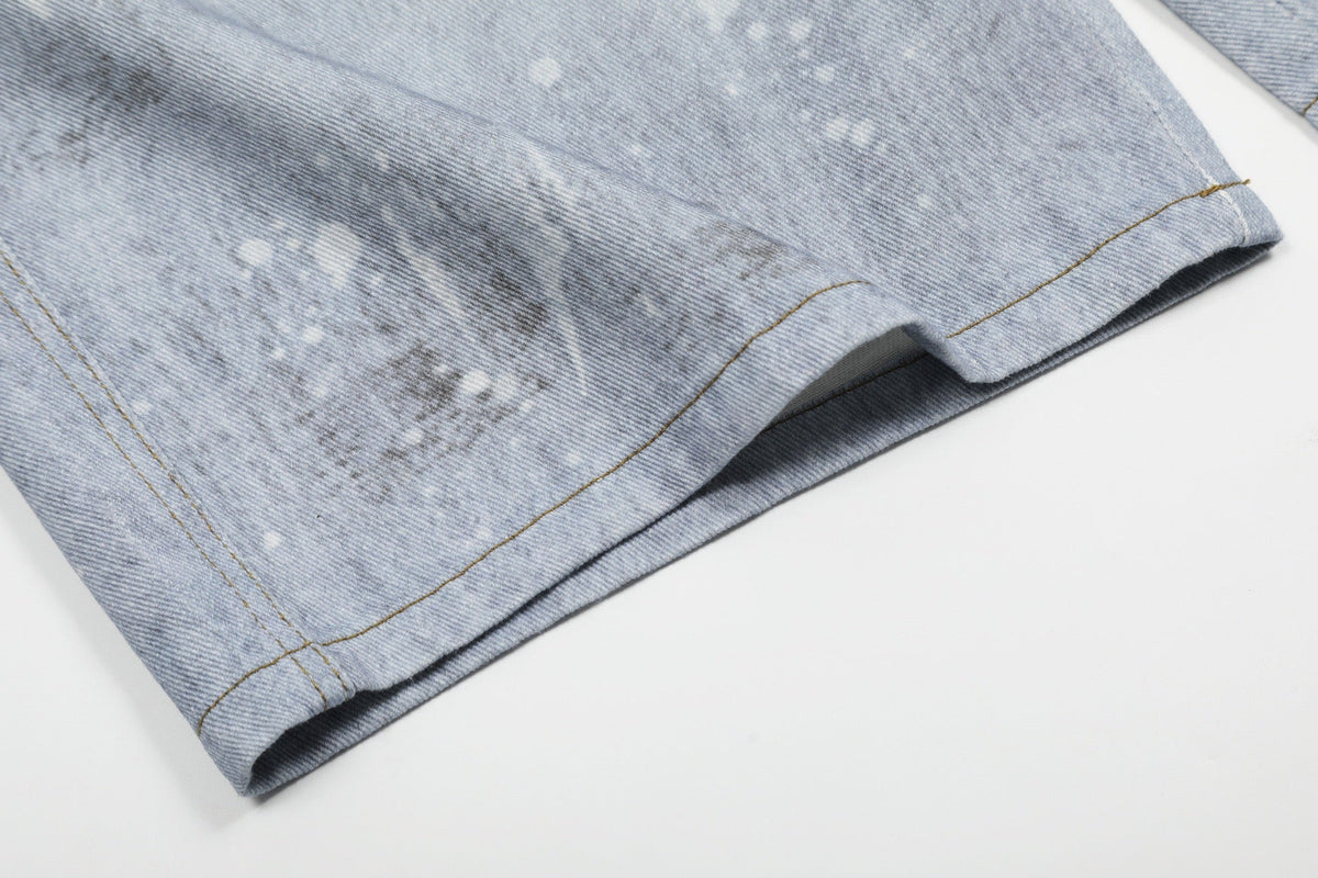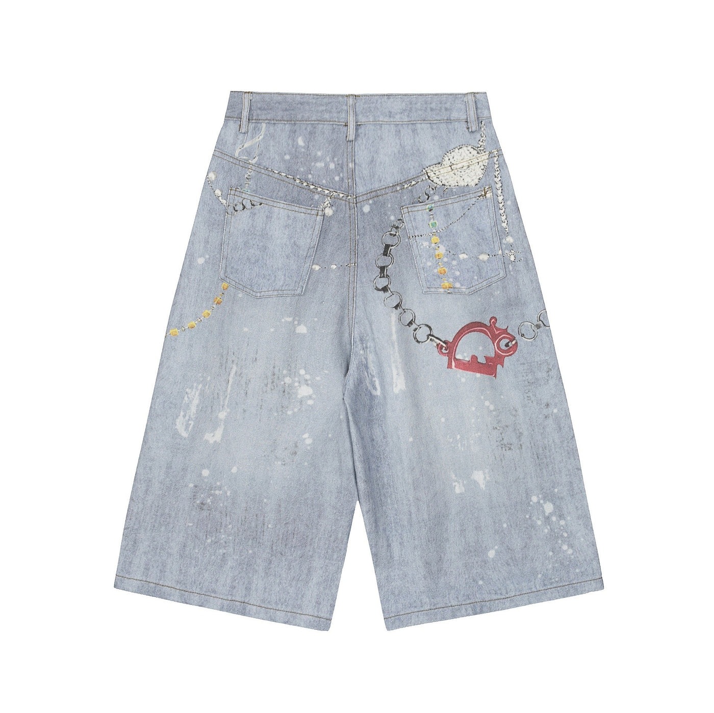 The Omirad Gem Chain Denim Shorts combine artistic detail with playful streetwear attitude. Featuring printed gem and chain graphics across a washed light-blue base, these shorts radiate a DIY charm that feels both nostalgic and futuristic. The relaxed wide-leg silhouette keeps the fit comfortable, while subtle distressed effects add a vintage edge — perfect for those who like their denim with personality.