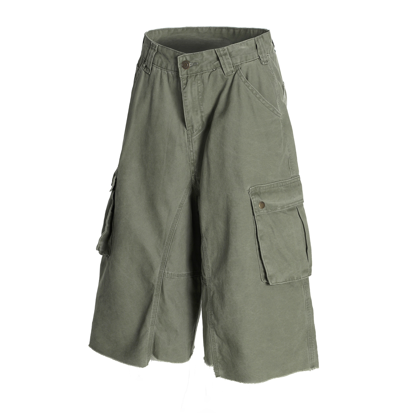 Clothing details: Wide-leg silhouette, oversized cargo pockets, raw-edge hem, reinforced panel seams, button + zip closure, utility-inspired design.