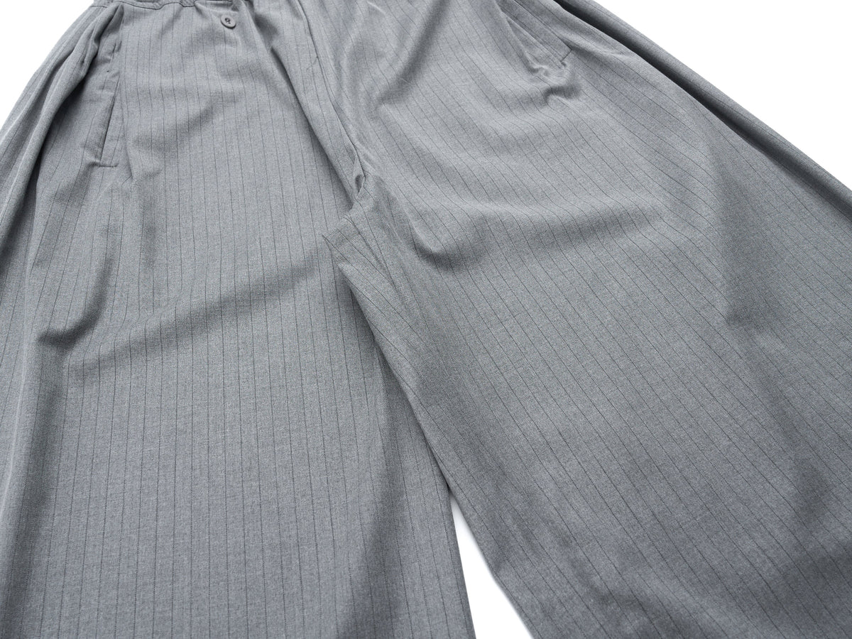 Clothing details: Dual-button waistband, pinstripe pattern, wide-leg silhouette, elastic back waist for comfort.