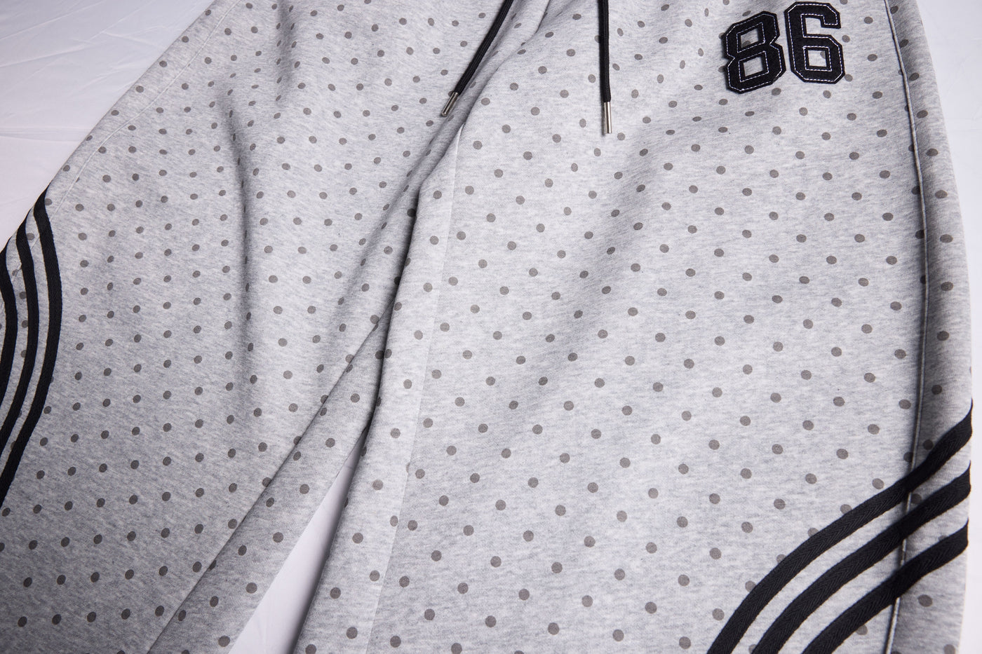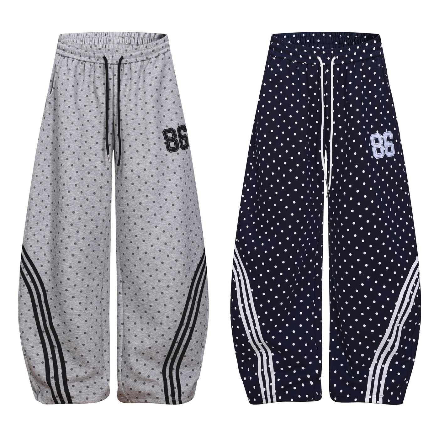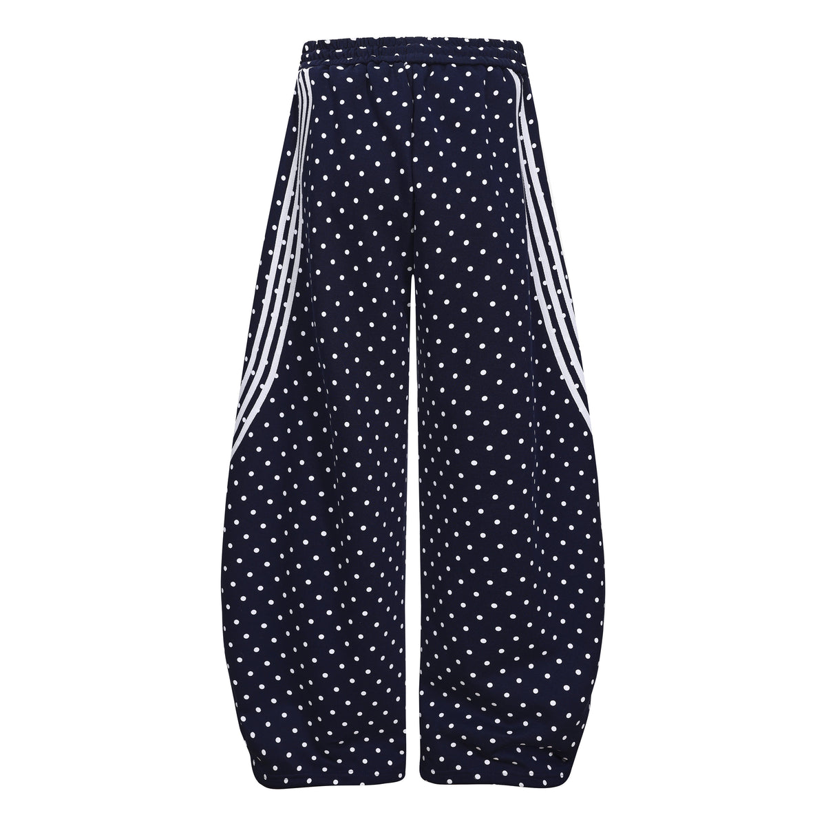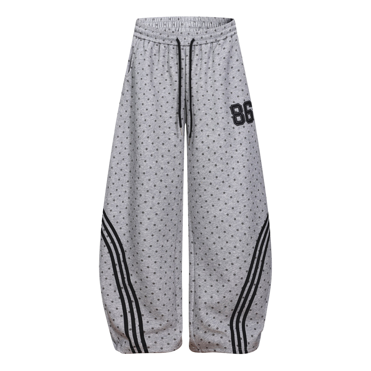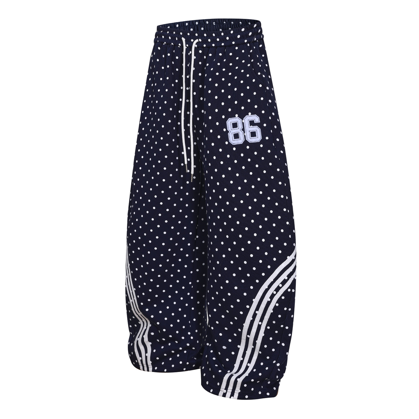 Clothing details: All-over polka dot print, curved stripe panels, elastic waistband with drawstring, wide-leg fit, embroidered number patch