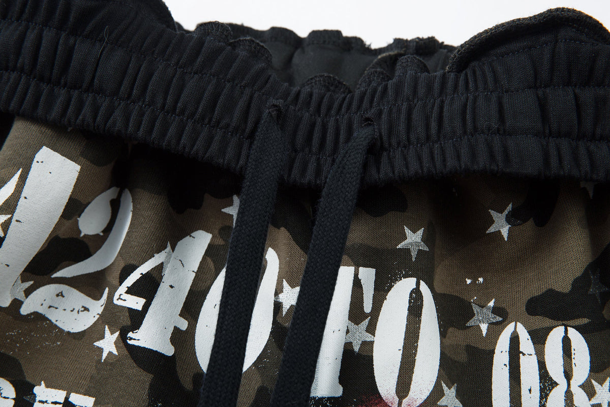 Clothing details: Camouflage and star print, vintage lettering, wide-leg fit, drawstring hem
