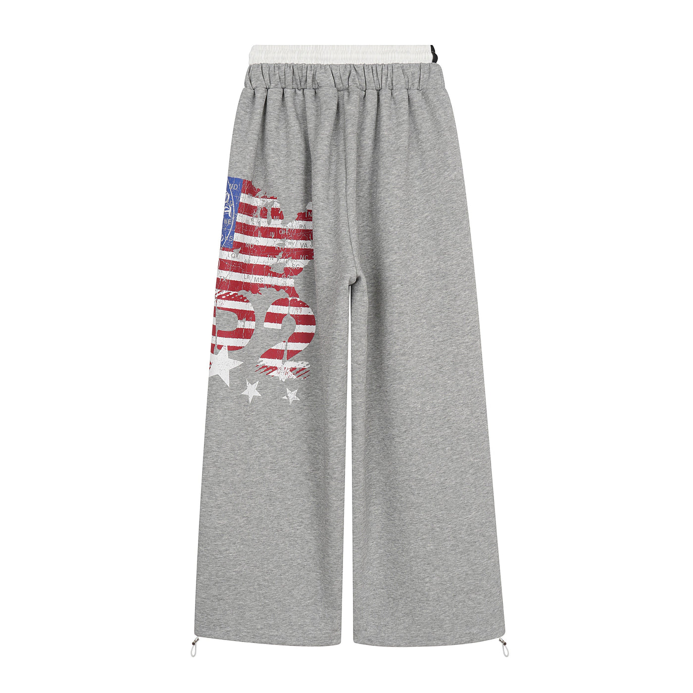 Clothing details: Distressed flag and graphic print on front and back, elastic waistband with adjustable drawstring, wide-leg straight cut, ankle drawstring adjusters, soft athletic fleece texture, relaxed streetwear fit.