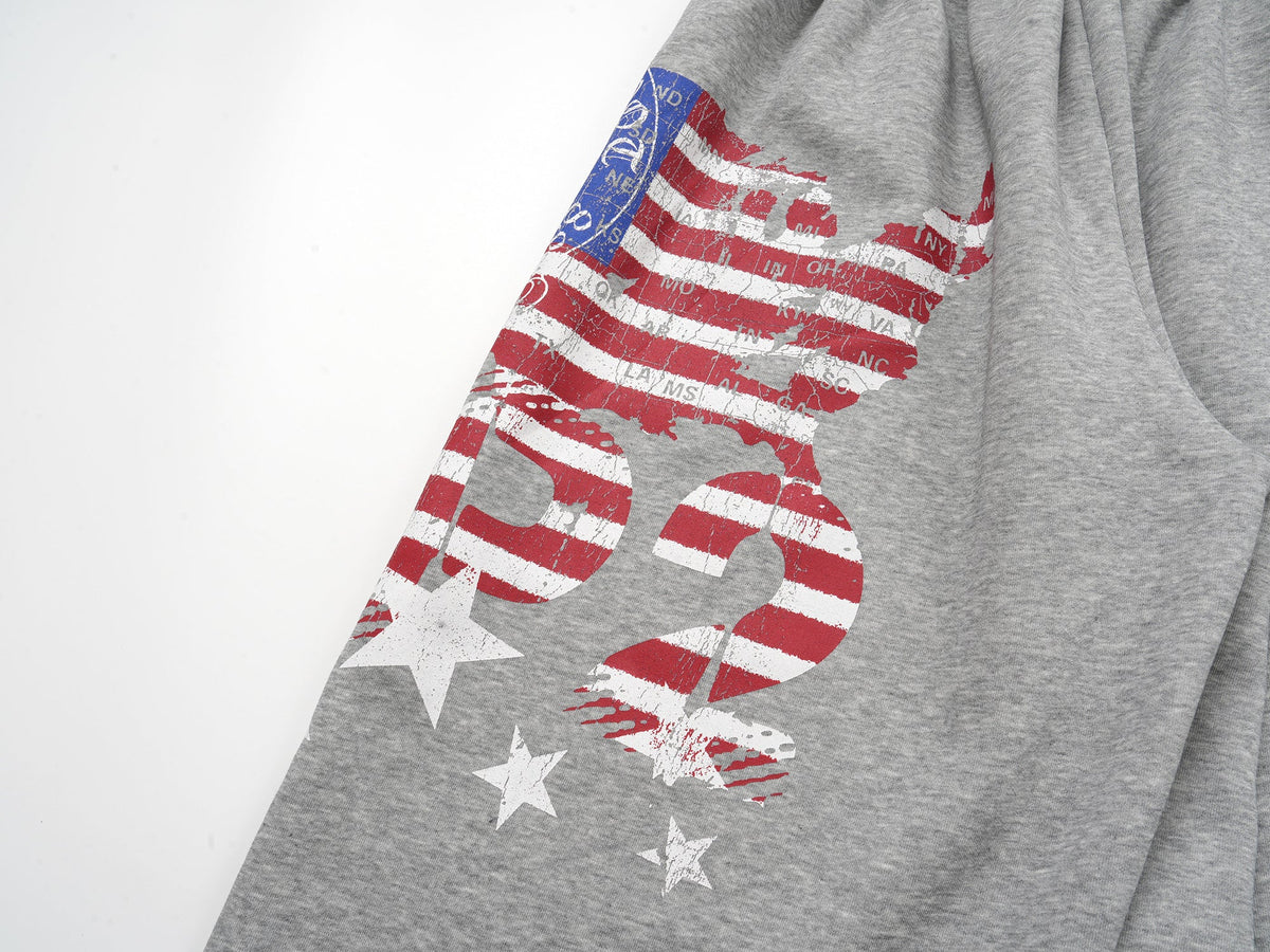 The Omirad Flag Graphic Wide-Leg Sweatpants feature a bold distressed American flag print layered with statement typography for a rebellious streetwear attitude. Designed with a relaxed wide-leg silhouette and adjustable ankle drawstrings, these sweatpants deliver effortless comfort with standout visual impact.