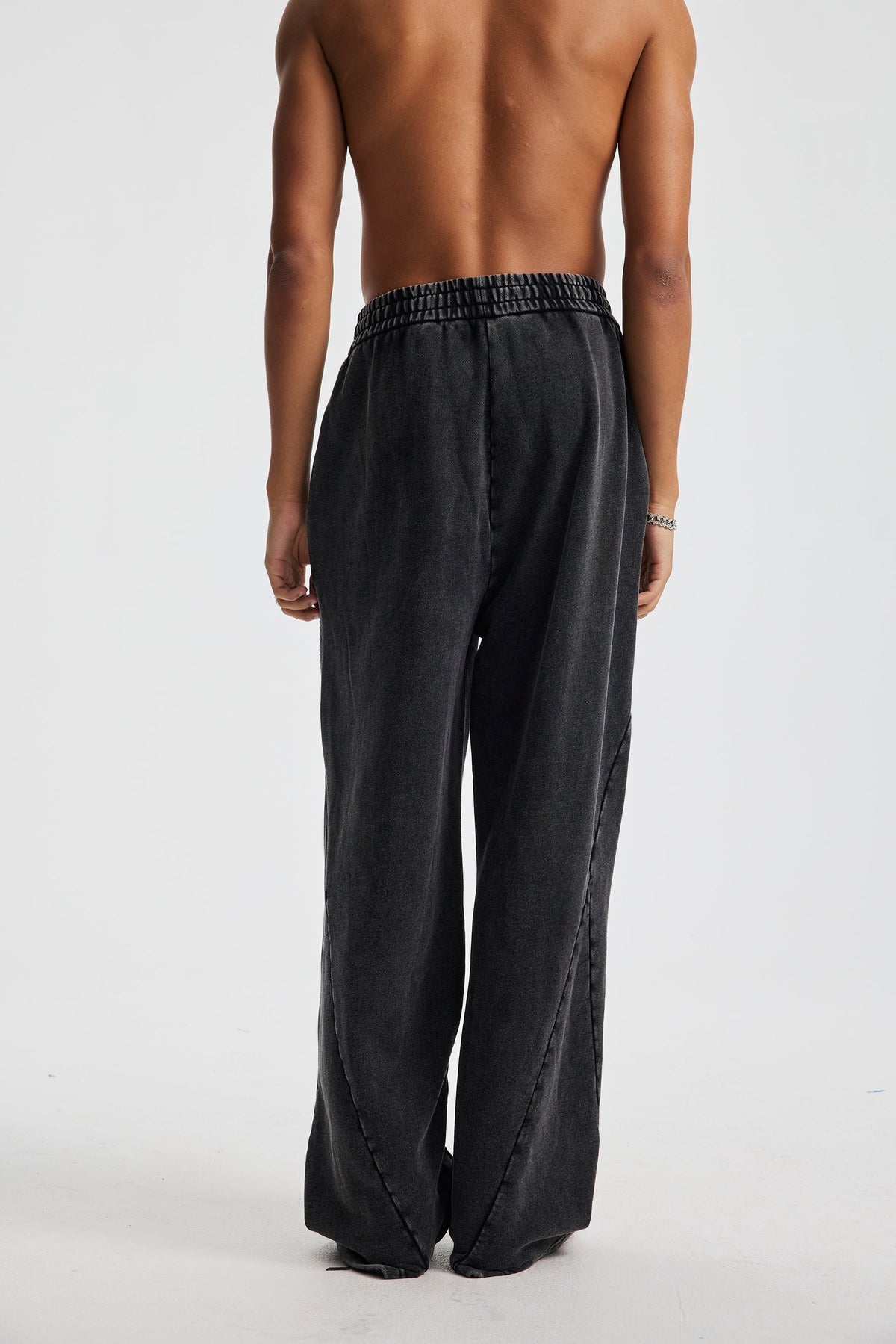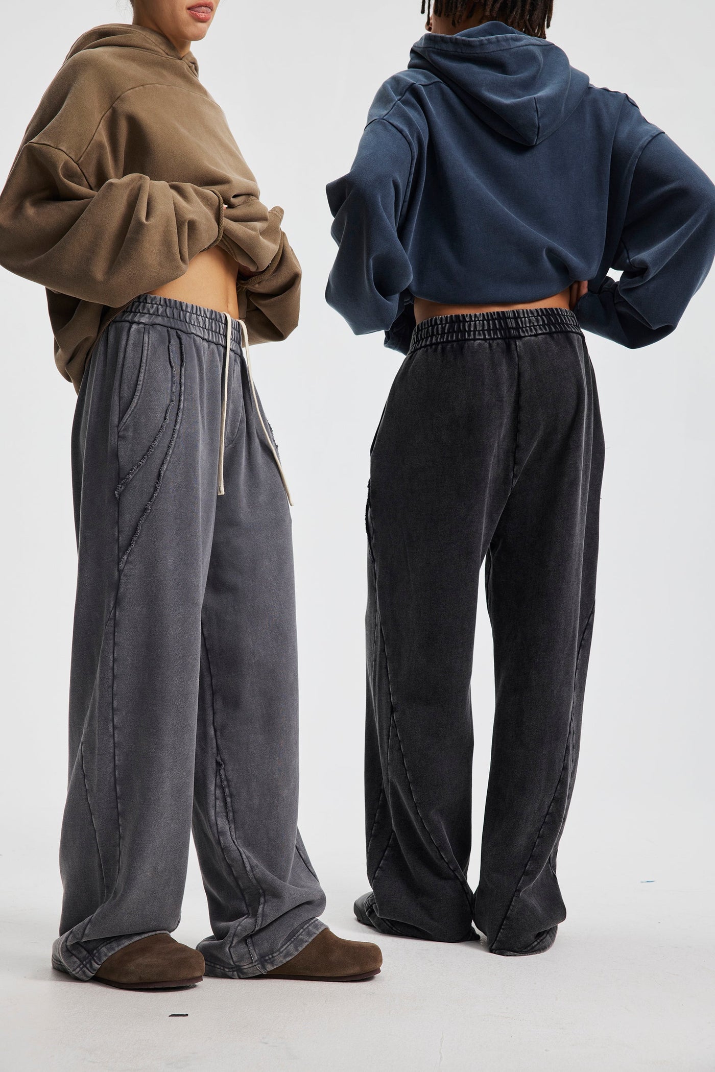 Clothing details: Exposed seamline design, vintage wash finish, elastic drawstring waist, wide-leg silhouette, relaxed drape