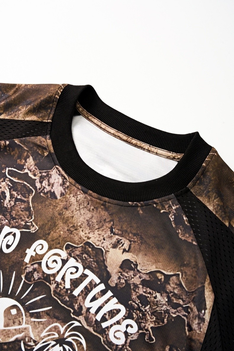 The Omirad Desert Fortune Performance Tee blends rugged terrain-inspired graphics with modern athletic construction. The earthy camouflage-style artwork paired with breathable mesh panels creates a bold outdoor-meets-streetwear aesthetic designed for comfort and movement.