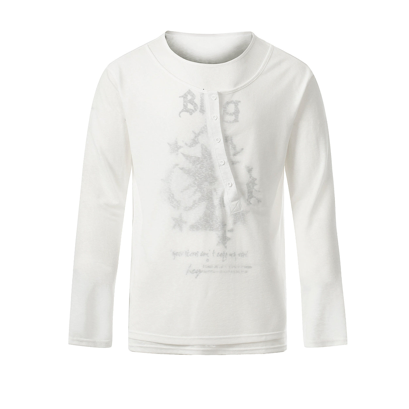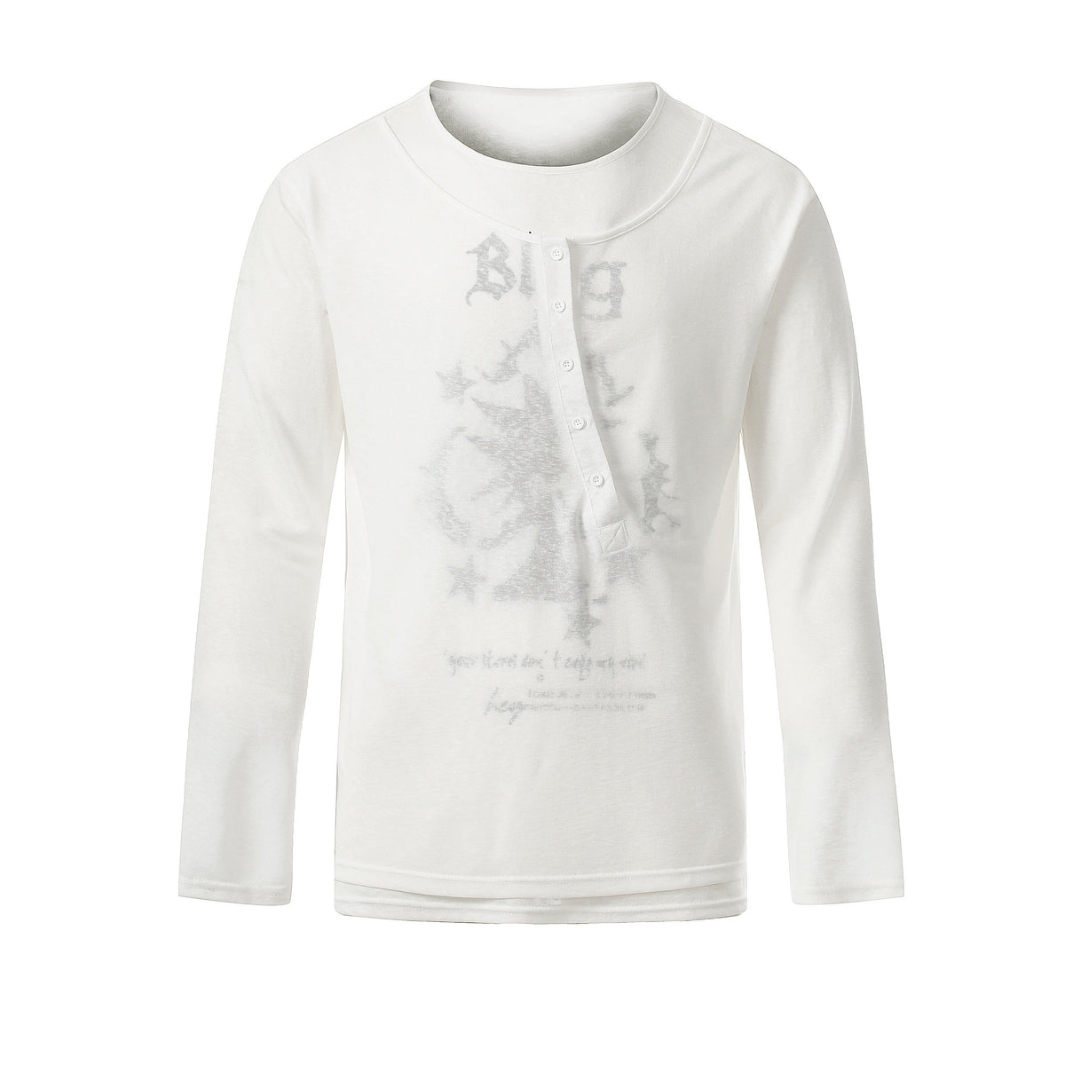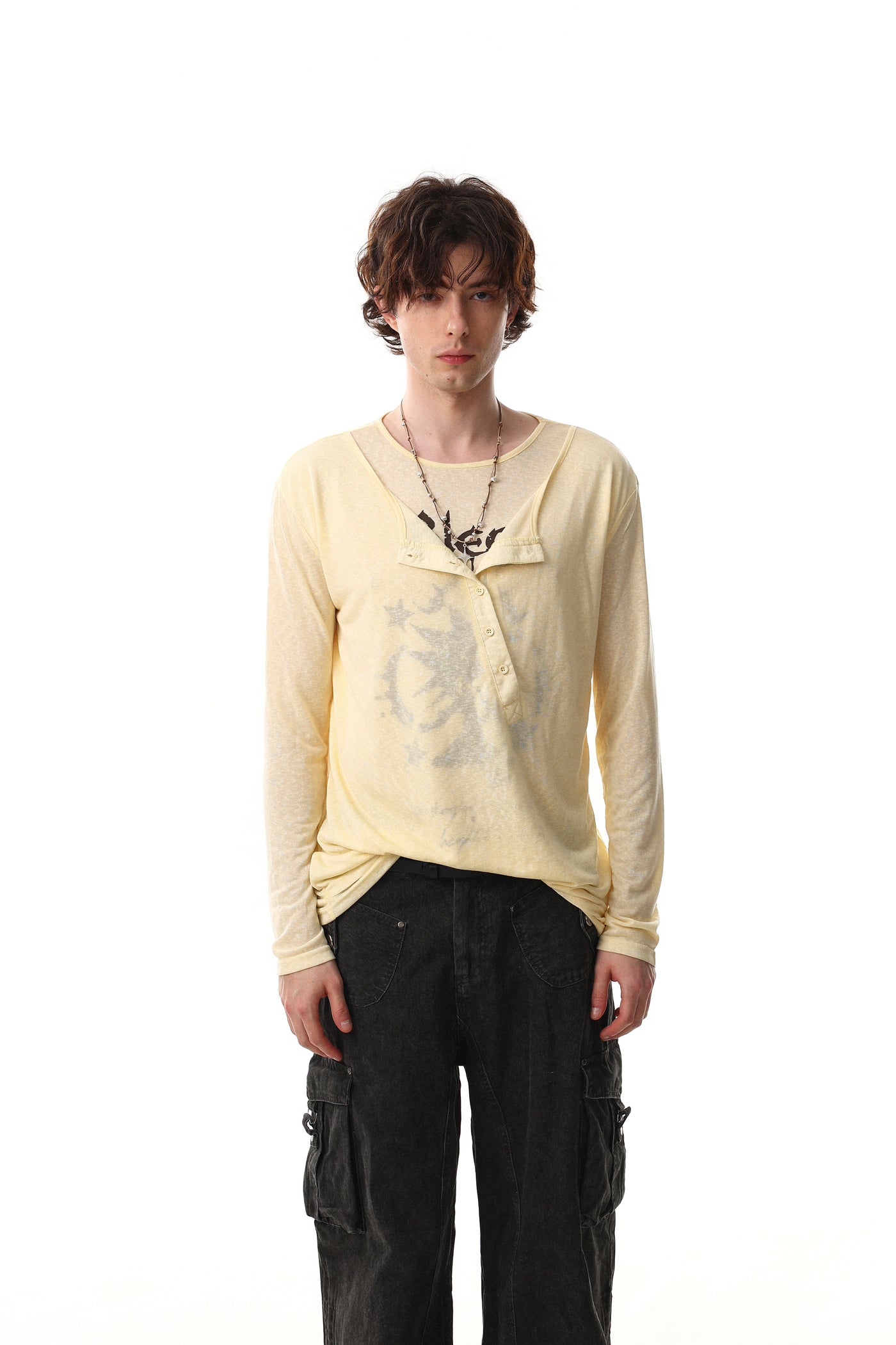 Clothing details: Faded graphic print, Henley button placket, long-sleeve silhouette.