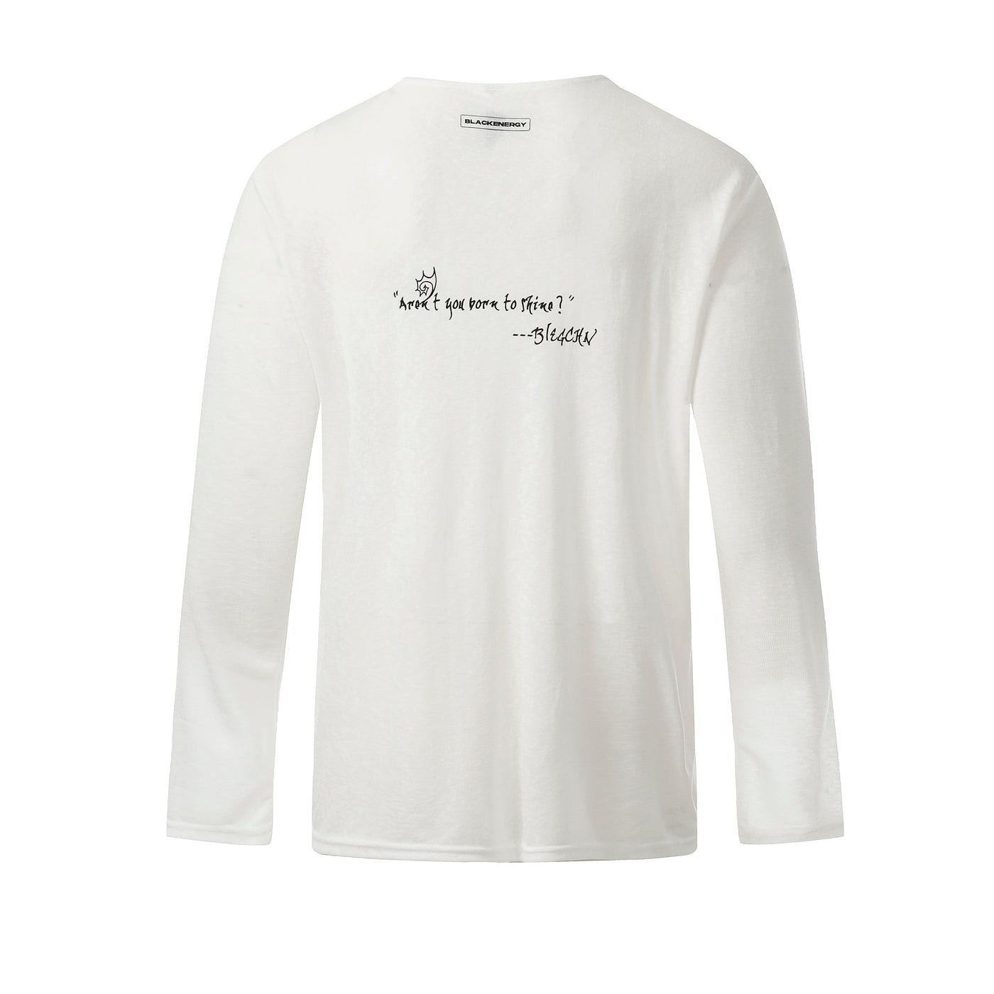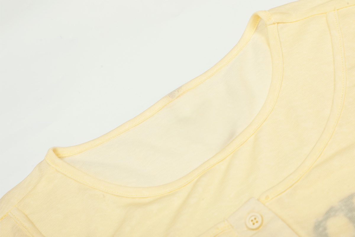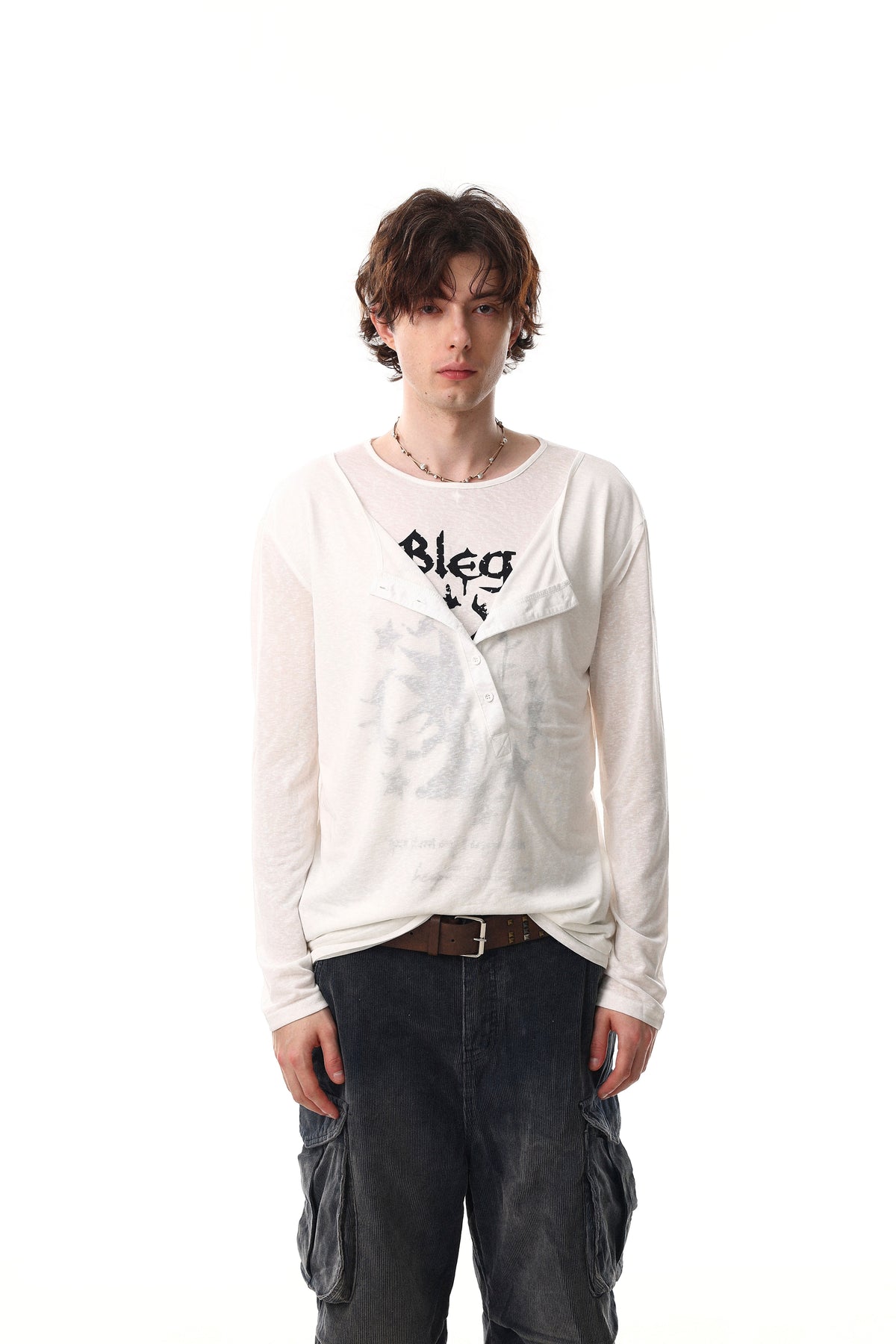 Clothing details: Faded graphic print, Henley button placket, long-sleeve silhouette.