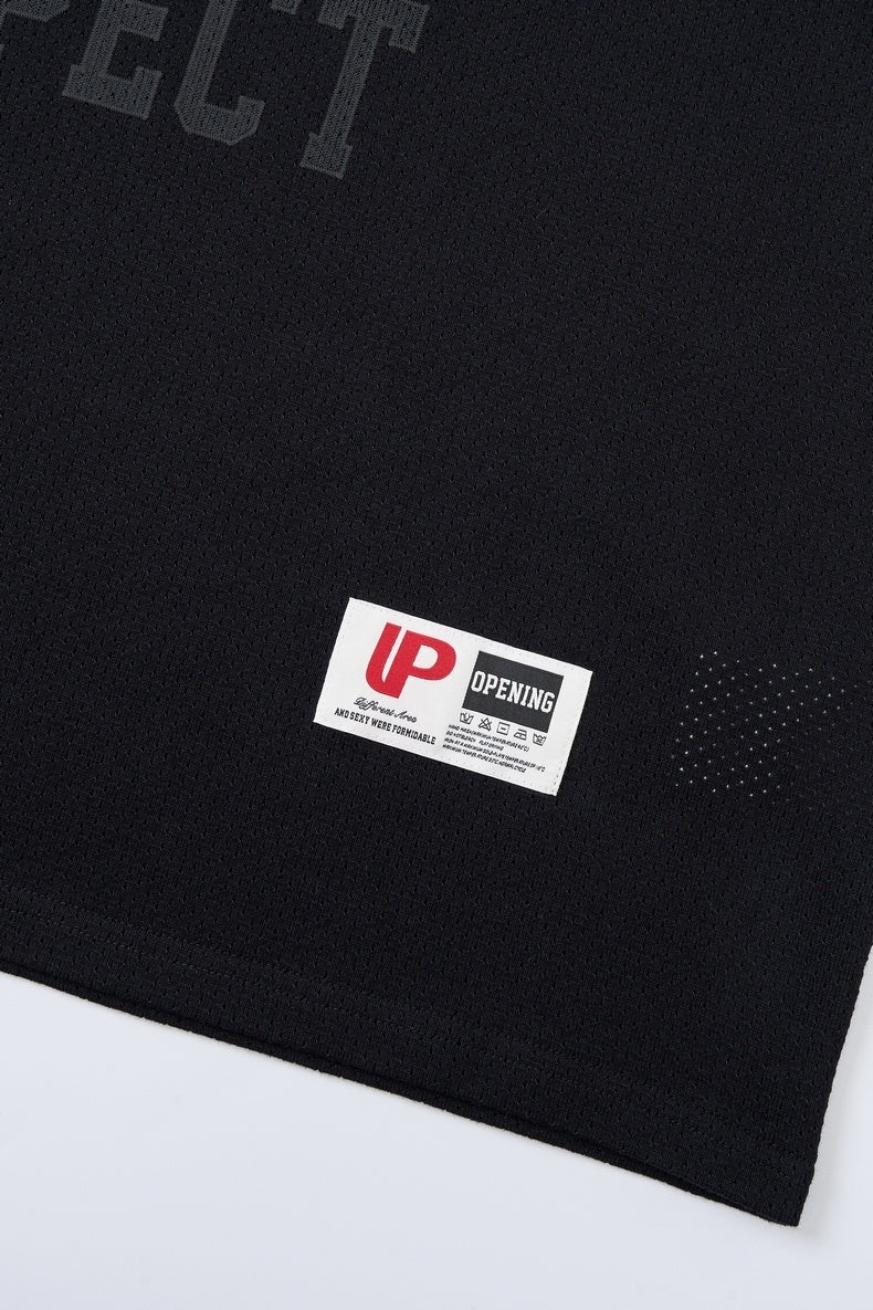 Clothing details: Soft breathable cotton fabric, classic V-neck collar, subtle “Los Angeles 24 Respect” graphic print, clean minimalist design, short sleeves, relaxed streetwear fit.