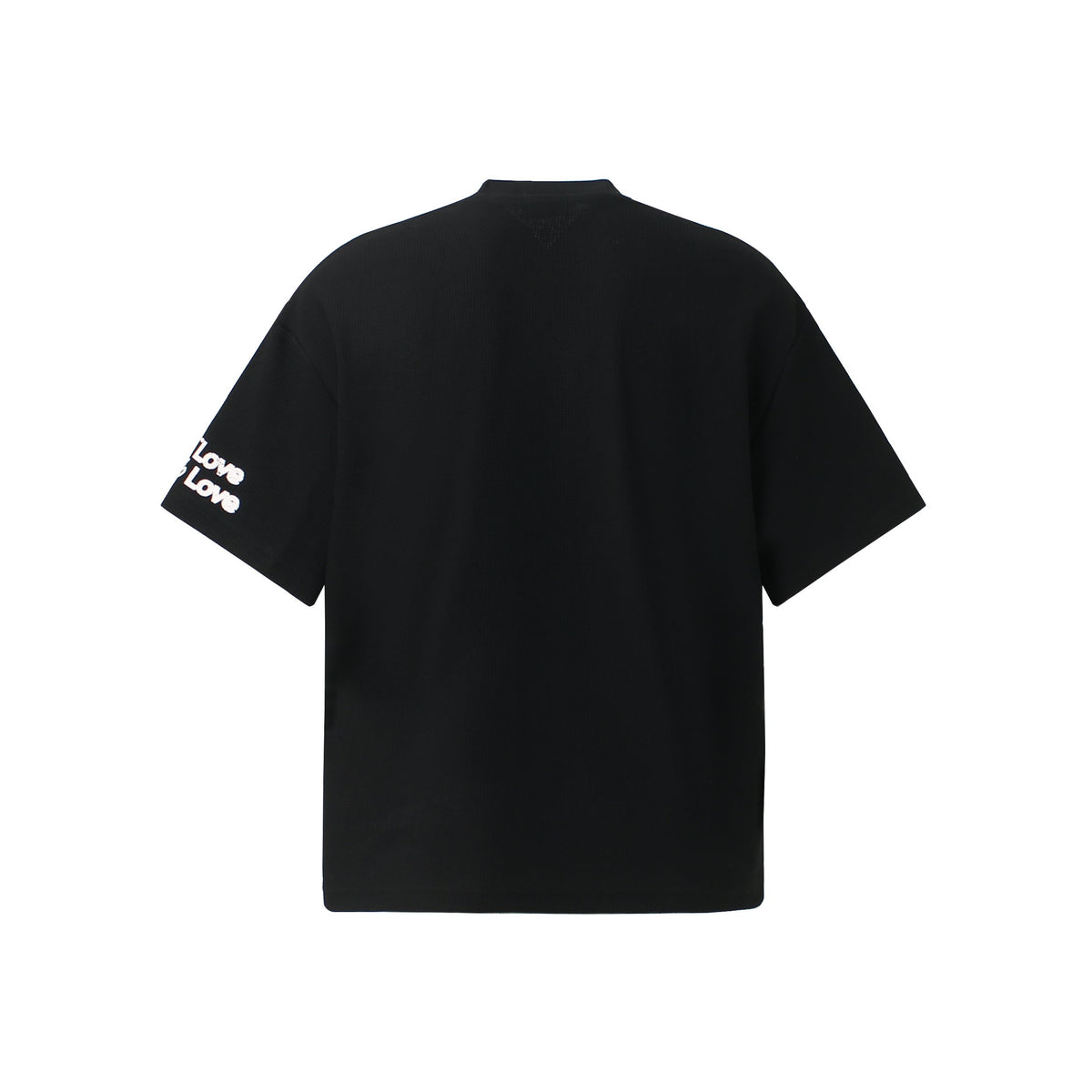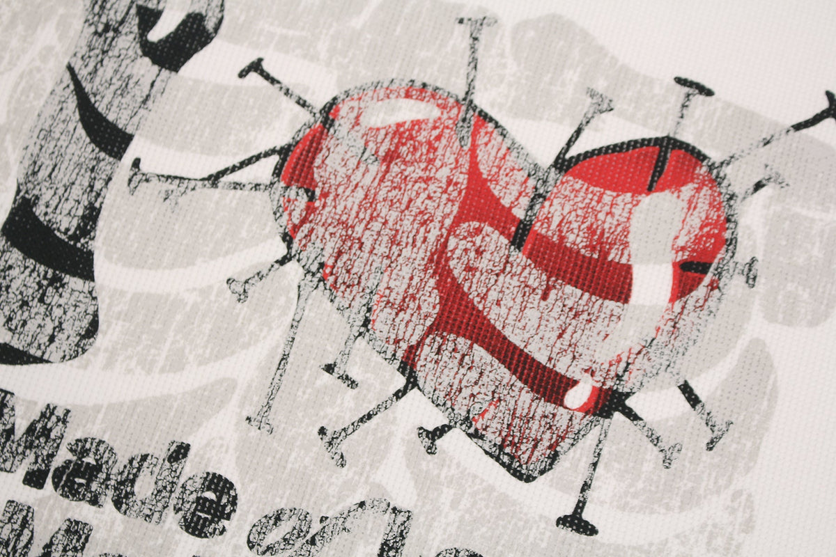 Clothing details: Distressed heart graphic, layered text print, high-contrast design, classic crew neck, relaxed streetwear fit.