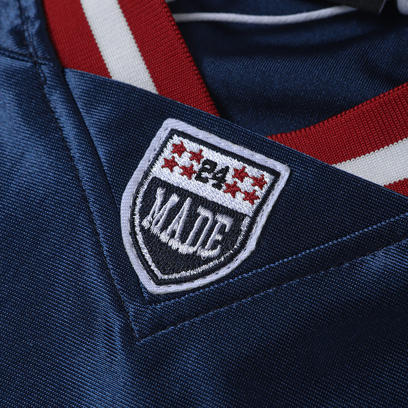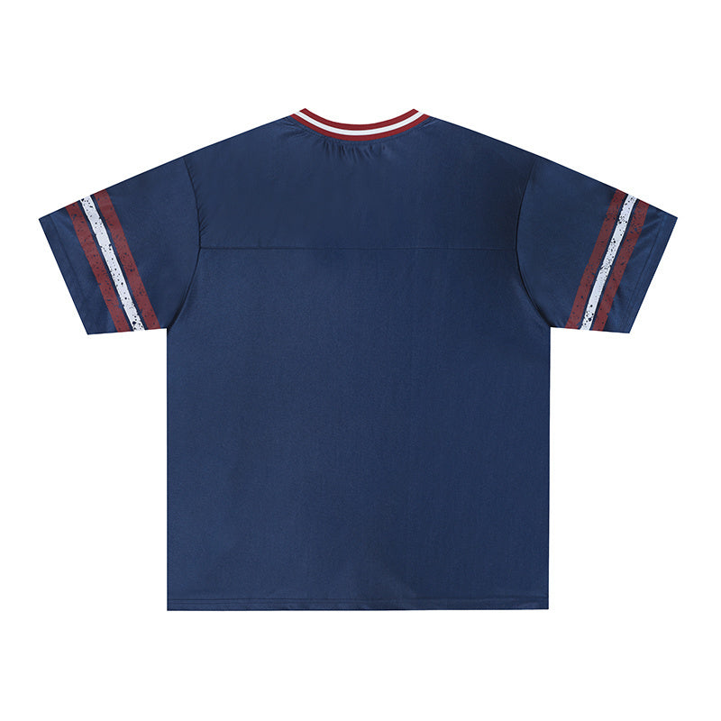 Clothing details: Logo print, contrast sleeve stripes, ribbed V-neck collar