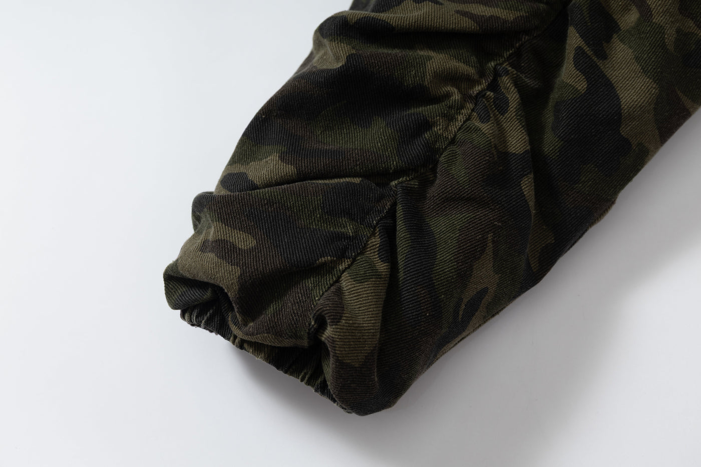 The Omirad Camo Hook Detail Distressed Jacket brings a rugged military aesthetic with a modern streetwear edge. Featuring a full camouflage pattern with raw distressed accents and metal hook closures, this piece combines rebellion and craftsmanship. The inner black hood adds depth and layering versatility, while the ruched sleeves enhance the structured silhouette. Made from a soft cotton-spandex blend, it offers both durability and comfort for any street-ready fit.
