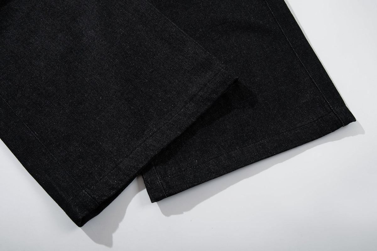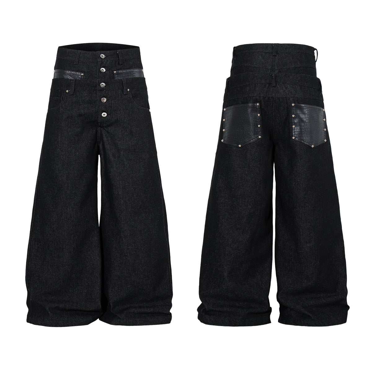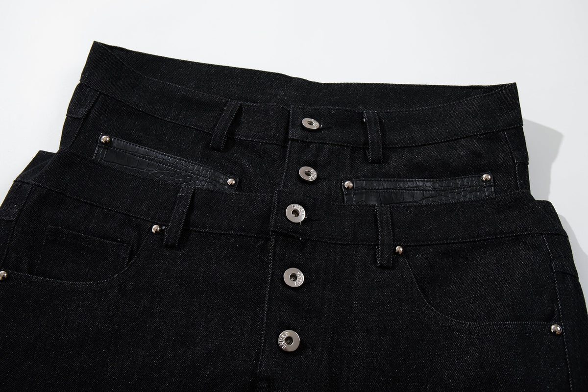 The Omirad Wide Leg Button Fly Denim Pants feature a bold, structured silhouette with a high-rise waist and extended wide-leg cut. Designed with a button fly front and reinforced panel detailing, these pants combine utilitarian elements with a strong streetwear profile. The contrast pocket accents add subtle texture while maintaining a clean overall look.