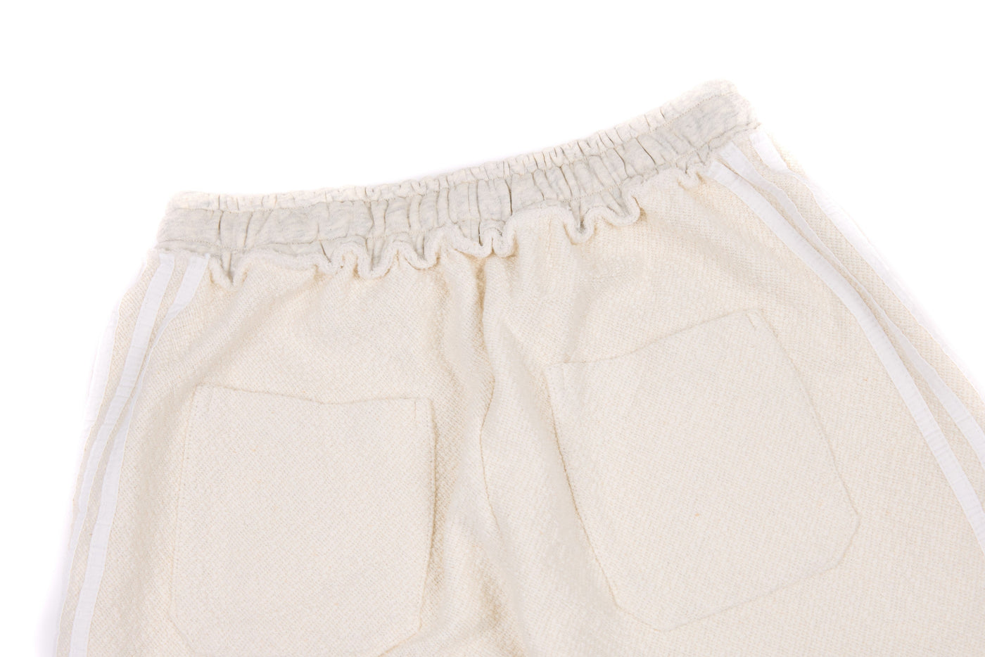 Clothing Details: Wide-leg fit, textured cotton fabric, adjustable drawstring waist, dual side stripes, front logo print