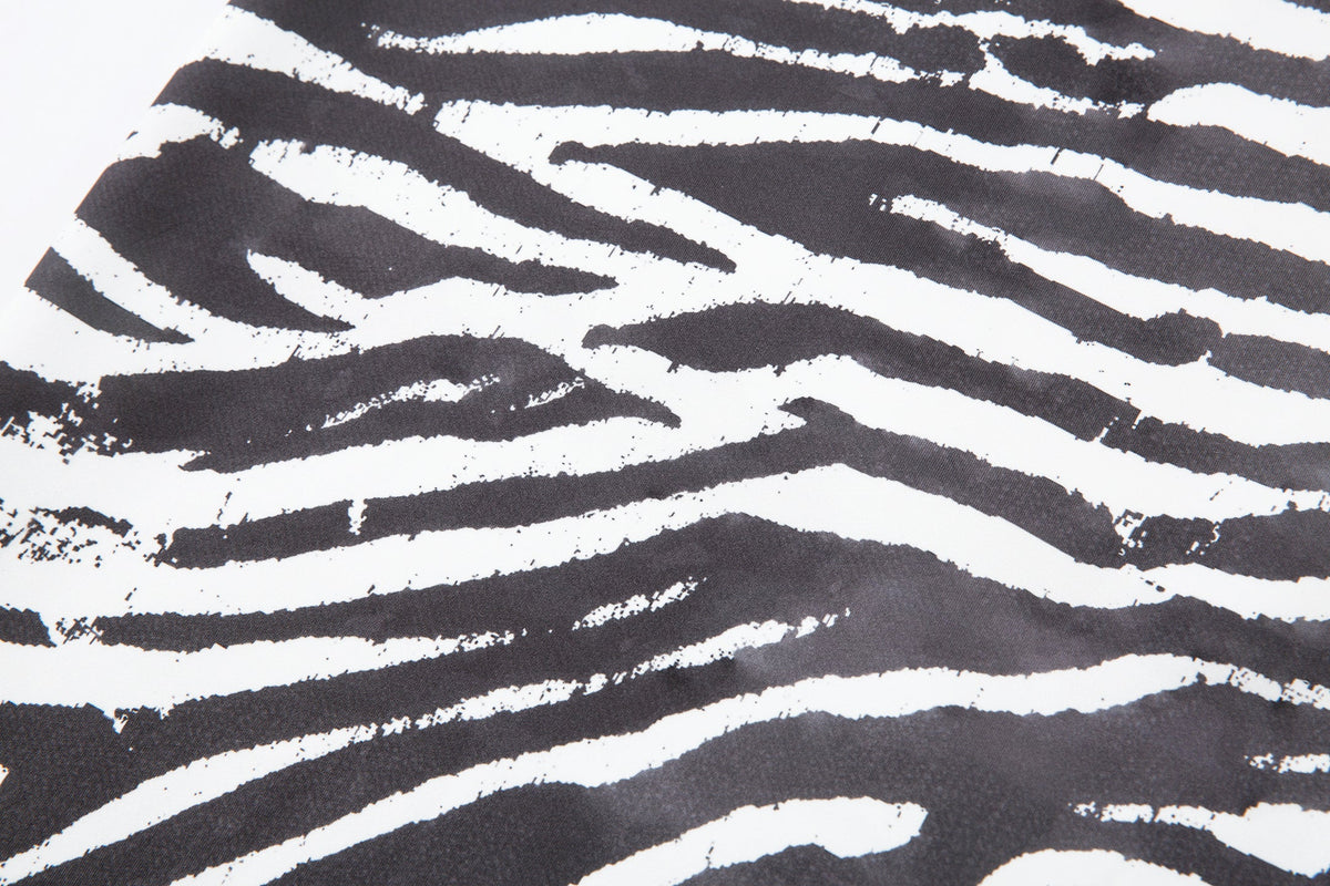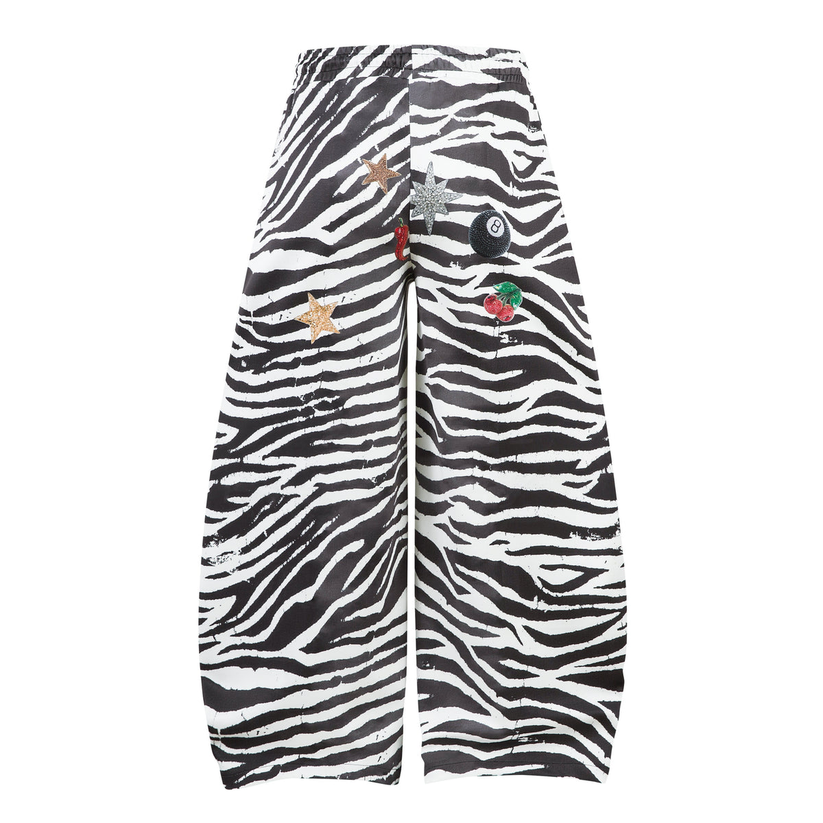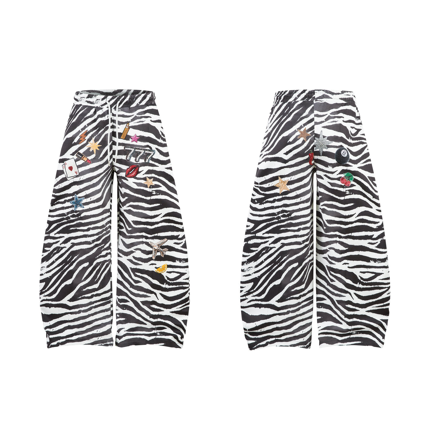 Clothing details: Zebra all-over print, embroidered and appliqué patches, elastic waistband with drawstring, relaxed wide barrel fit, Omirad street-art signature style.
