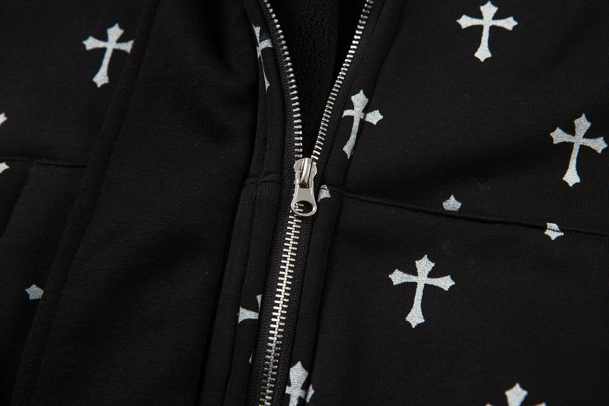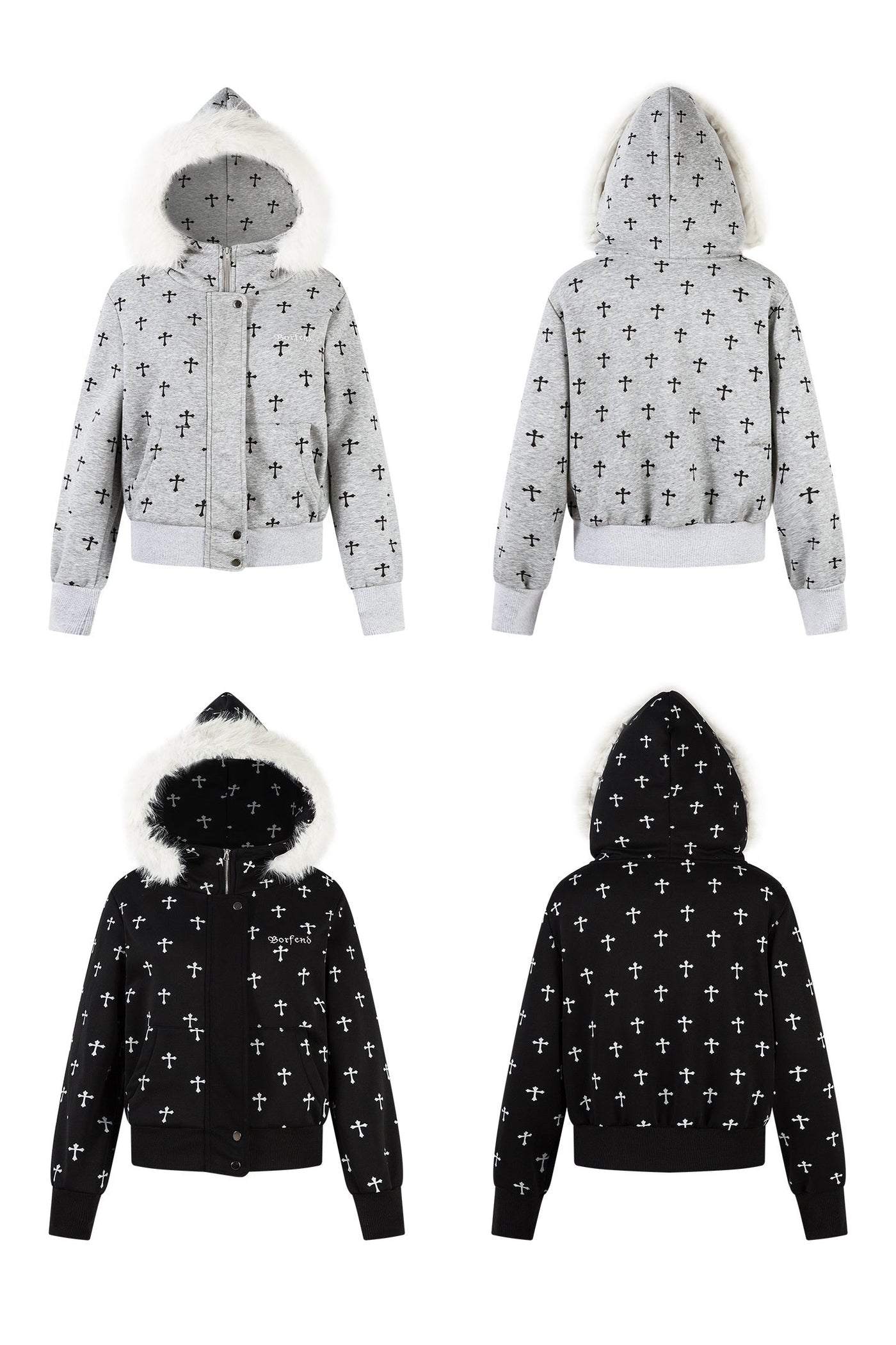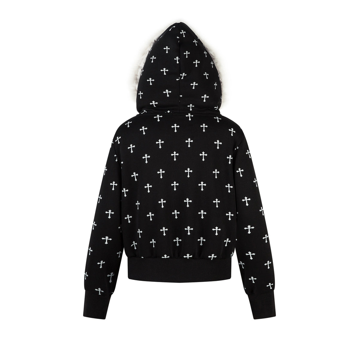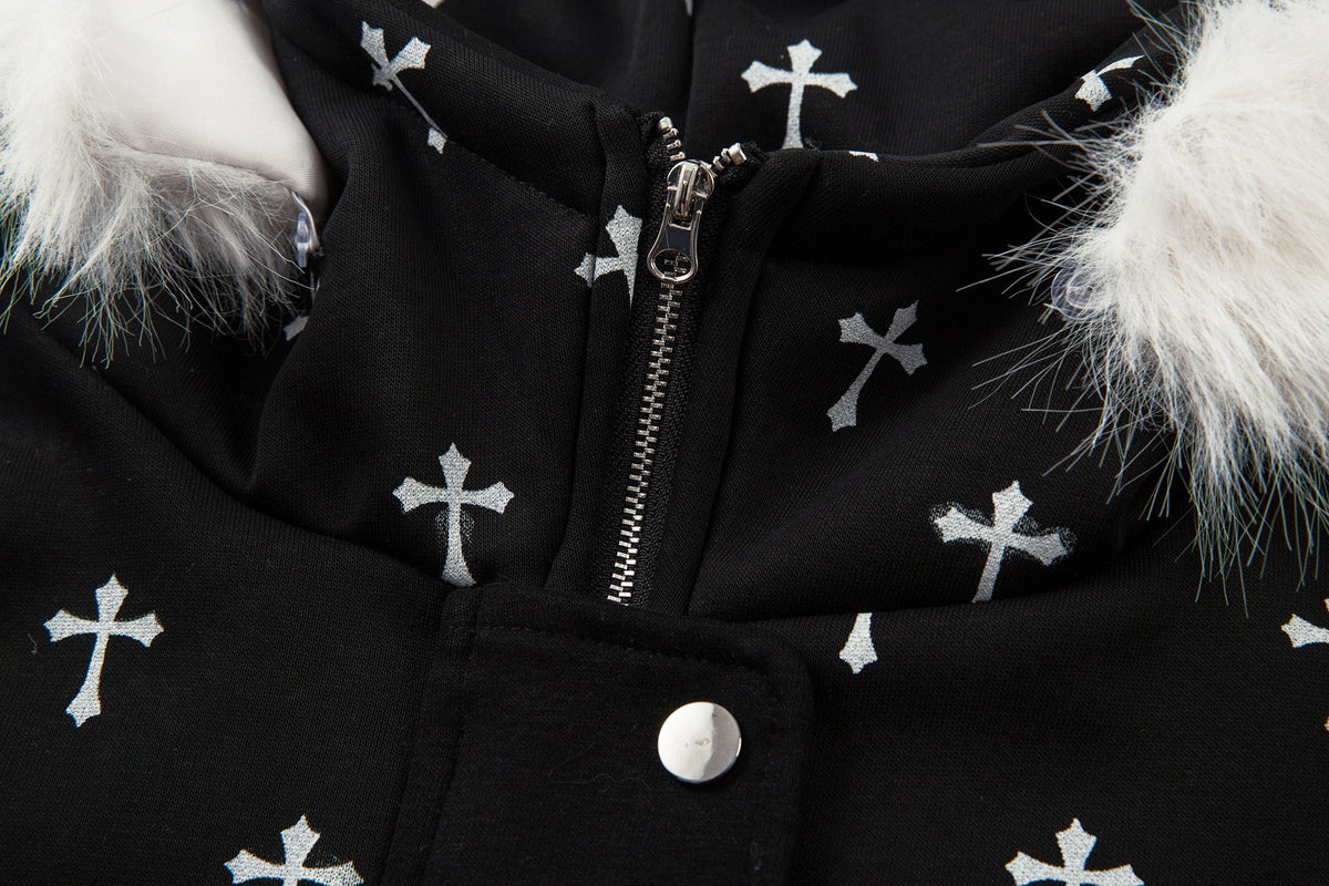 3-6-5.shop Cross Print Faux Fur Hooded Jacket