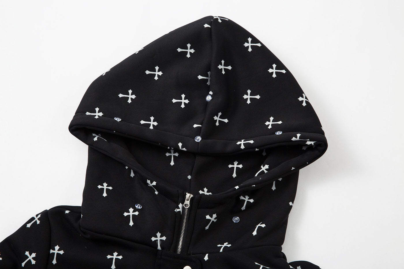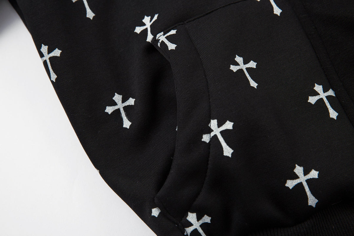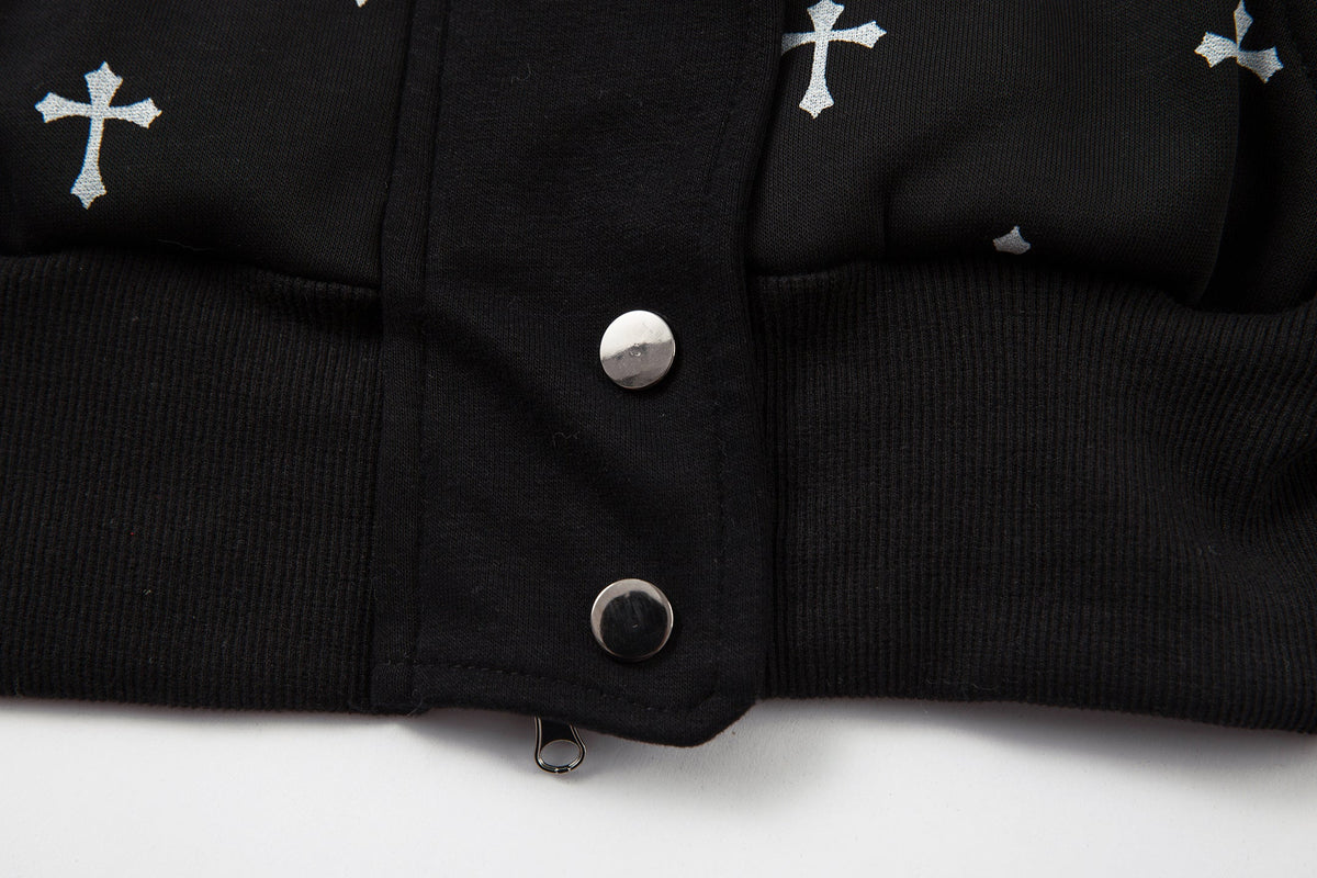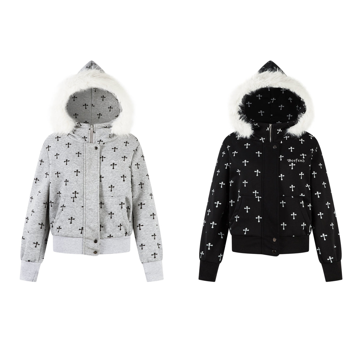 The Omirad Cross Print Faux Fur Hooded Jacket blends cozy warmth with bold street attitude. Featuring an all-over gothic cross pattern and detachable faux fur trim around the hood, it offers a perfect mix of statement design and functionality. The cropped fit and ribbed hem add structure, while the cotton-poly blend ensures comfort and durability for everyday layering.